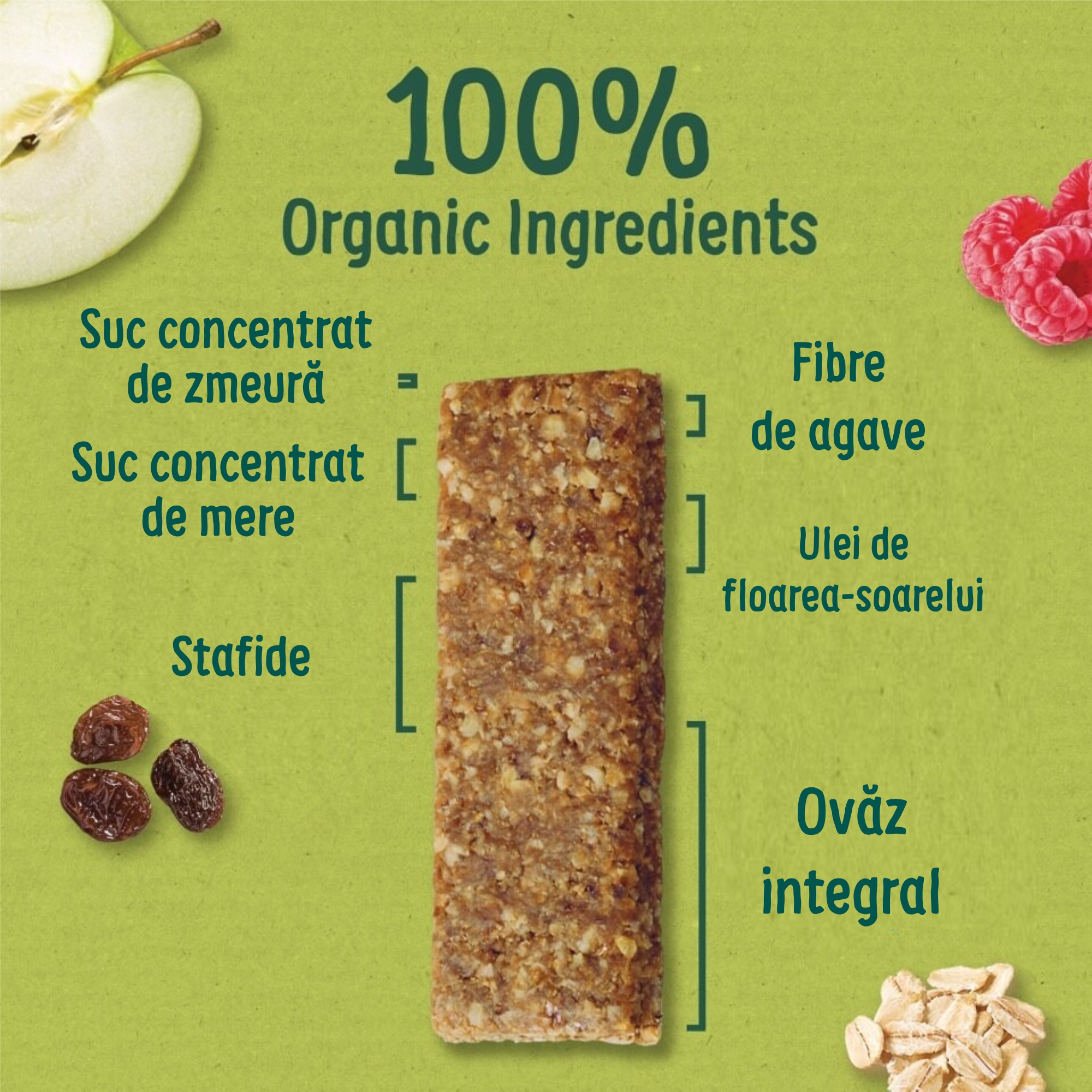 OVAZ ecologic integral 49,5%, stafide ecologice (contin ulei ecologic de floarea-soarelui) 19,8%, ulei ecologic de floarea-soarelui 10,9%, suc ecologic concentrat de mere 8,9%, suc ecologic concentrat de capsuni 2,0%, fibre ecologice de agave (inulina) 7,9% si suc ecologic concentrat de capsuni 3,0%.
