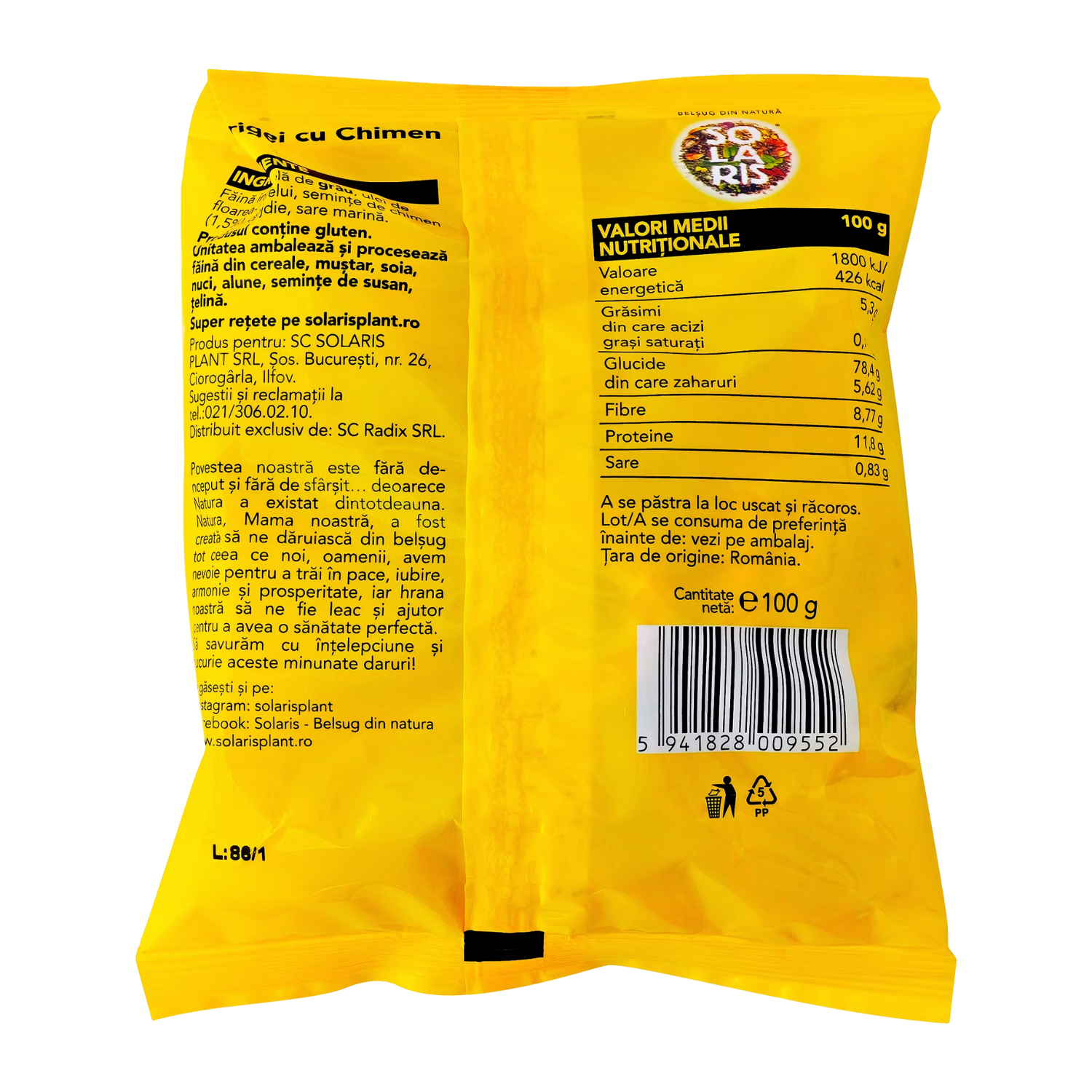 Faina integrala de grau, ulei de floarea-soarelui, seminte de chimen (1,5%), drojdie, sare marina.