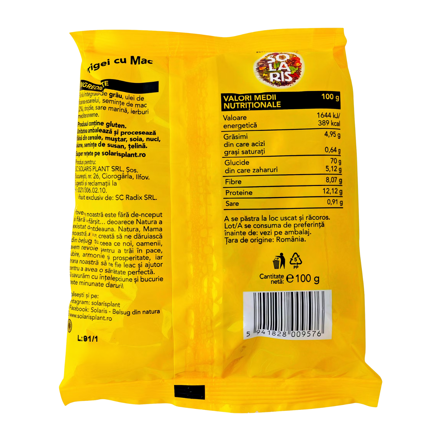 Covrigeii Solaris au fost produsi dupa o reteta speciala, fara afanatori pentru faina si fara aditivi sau conservanti. Gustul este in intregime natural. Au o valoare nutritiva superioara covrigeilor si grisinelor produse din faina alba sau din faina tratata cu afanatori/amelioratori. Solaris a pregatit pentru toata familia o gustare delicioasa si la indemana, acasa, la serviciu sau in calatorie.