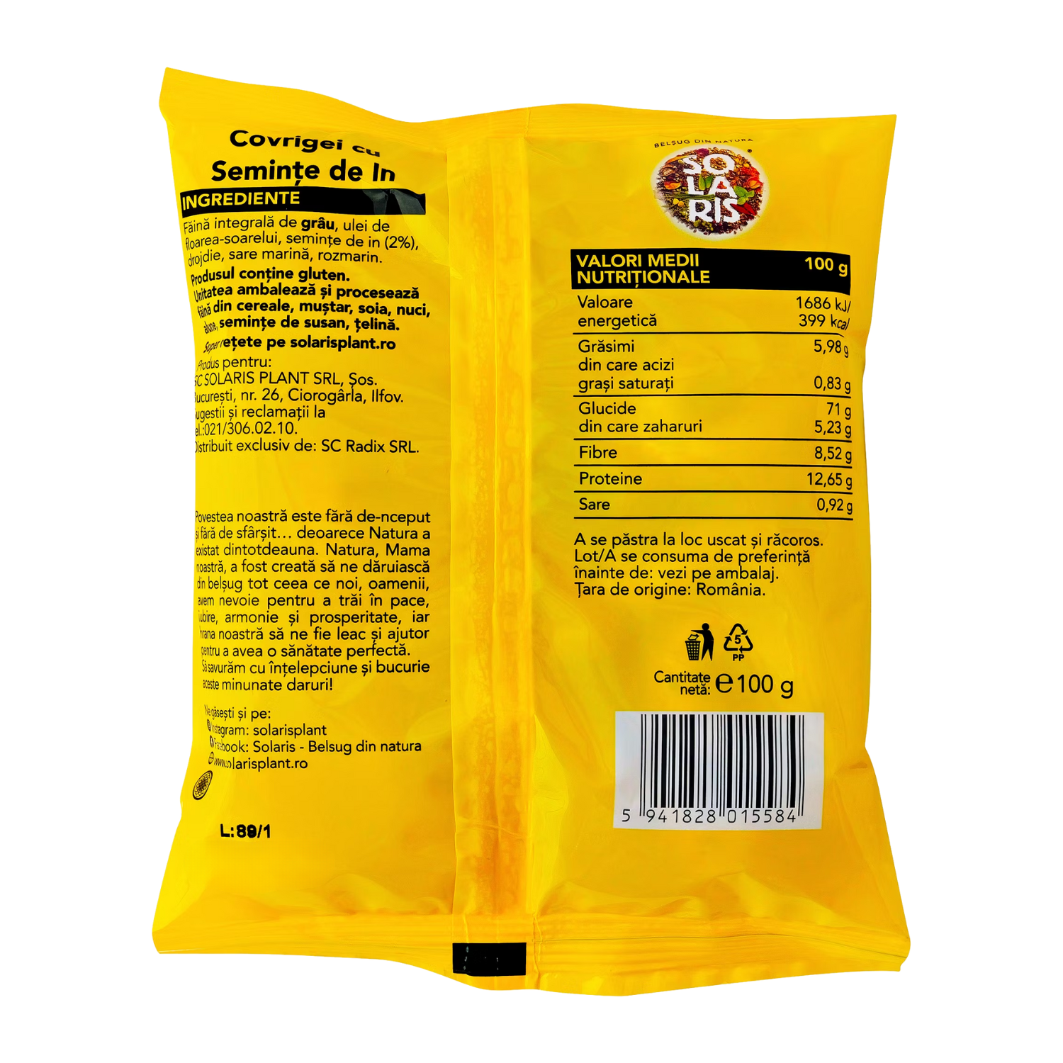 Covrigeii Solaris au fost produși după o rețetă specială, fără afânători pentru făină și fără aditivi sau conservanți. Gustul este în întregime natural. Au o valoare nutritivă superioară covrigeilor și grisinelor produse din făină albă sau din făină tratată cu afânători/amelioratori. Solaris a pregătit pentru toată familia o gustare delicioasă și la îndemână, acasă, la serviciu sau în călătorie.