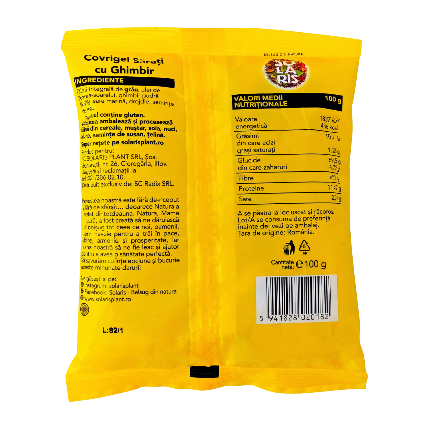 Covrigeii Solaris au fost produsi dupa o reteta speciala, fara afanatori pentru faina si fara aditivi sau conservanti. Gustul este in intregime natural. Au o valoare nutritiva superioara covrigeilor si grisinelor produse din faina alba sau din faina tratata cu afanatori/amelioratori. Covrigei crocati si cu gust bogat, perfecti pentru un moment de relaxare si rasfat sau pentru o gustare rapida.