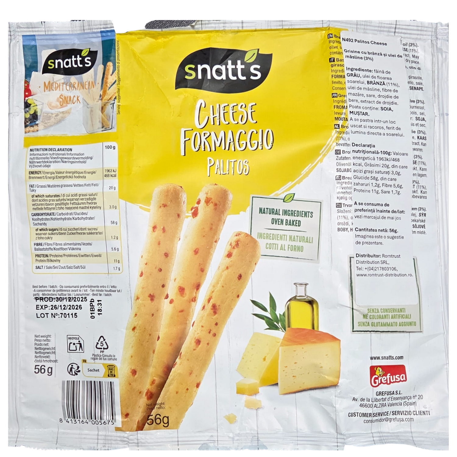 Grisinele Snatt’s cu brânză și ulei de măsline sunt o gustare crocantă și savuroasă, coaptă în cuptor, realizată din ingrediente atent selecționate. Combinația echilibrată de brânză și ulei de măsline oferă un gust bogat și autentic, fiind ideale pentru pauze rapide sau ca aperitiv. Produs fără conservanți, coloranți artificiali sau ulei de palmier.