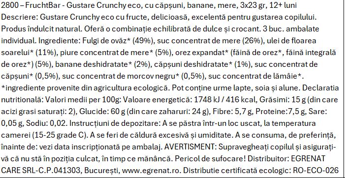 Gustare Crunchy eco cu fructe, delicioasă, excelentă pentru gustarea copilului. Produs îndulcit natural. Oferă o combinație echilibrată de dulce și crocant. 3 buc. ambalate individual.
