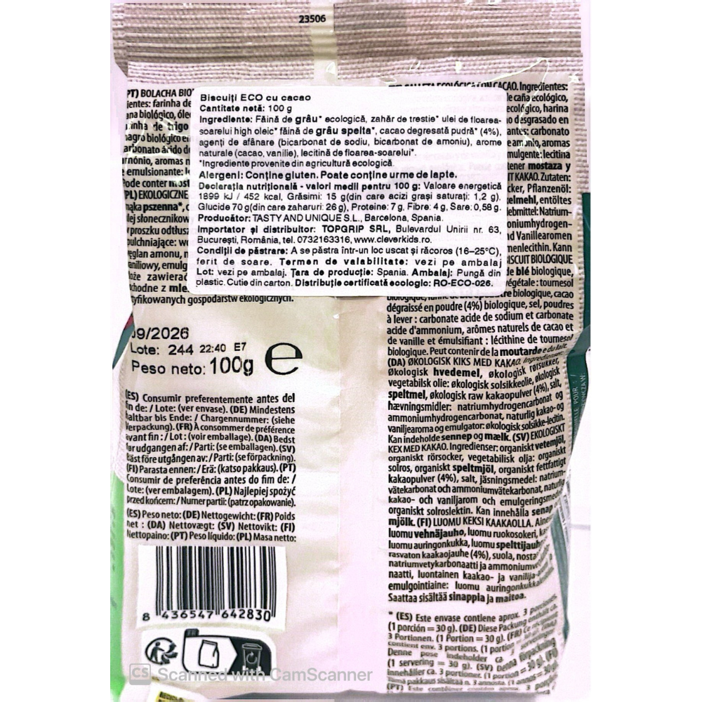 Mini Biscuiții BIO cu cacao  sunt realizați din ingrediente ecologice atent selecționate și oferă un gust plăcut, potrivit pentru copii și întreaga familie. Textura crocantă și aroma naturală de cacao transformă fiecare pauză într-un moment delicios.