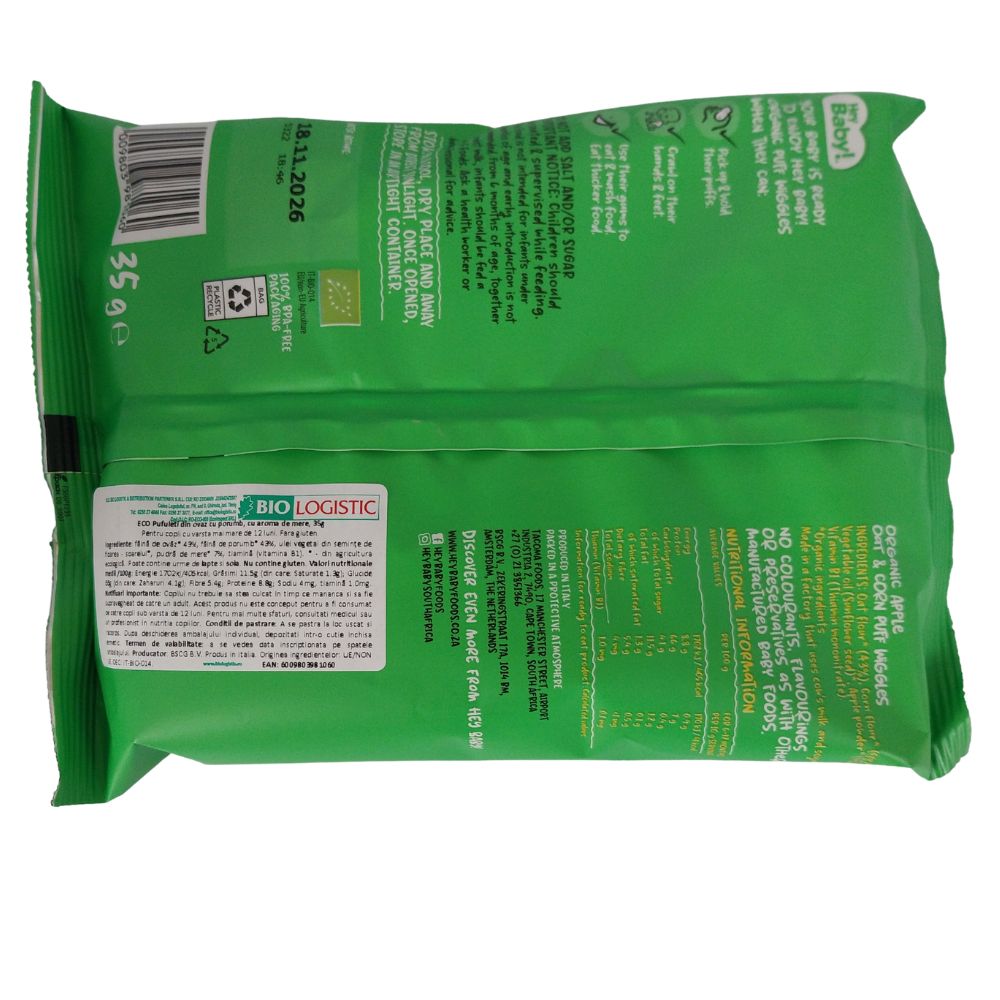Acest produs este ideal pentru bebelusii care isi tin singuri gustarile in manute si care mesteca deja cu usurinta. Pufuletii ondulati Hey Baby sunt usor crocanti, dar se dizolva rapid in gura. Cu aroma delicata de mere,