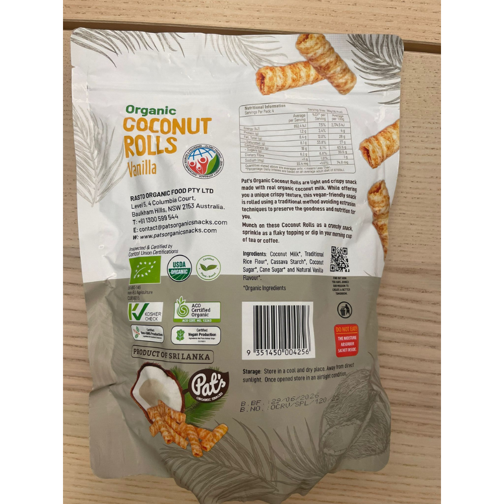 Pat’s Rulouri Crocante Organice din Nucă de Cocos cu Vanilie sunt gustări exotice, delicioase și crocante, realizate din ingrediente 100% organice.