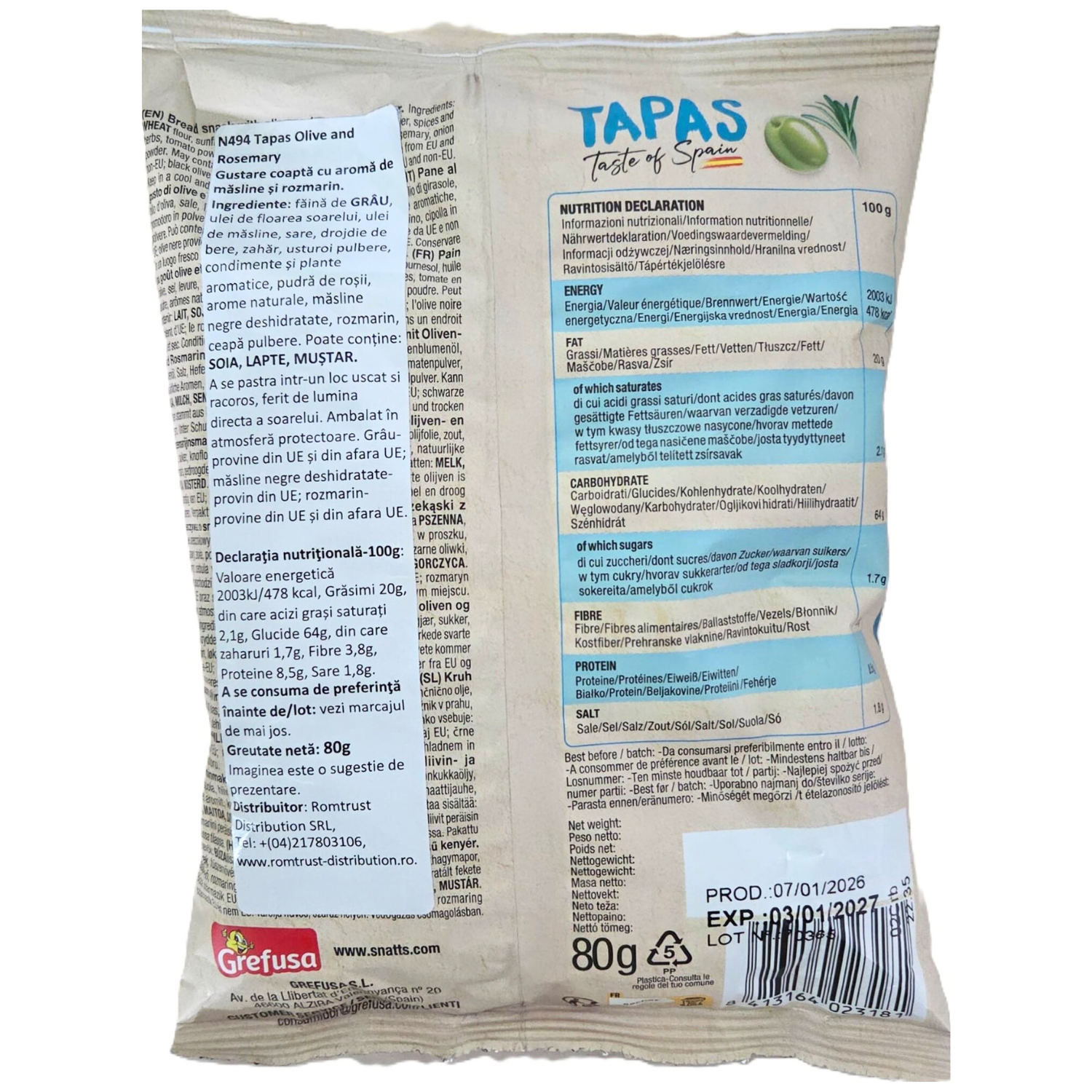 Tapas – Snacks cu măsline și rozmarin sunt snack-uri crocante și gustoase, coapte în cuptor, cu ulei de măsline și arome naturale. Fără conservanți și coloranți artificiali, fără ulei de palmier și 100% vegan. Ideal pentru gustări sănătoase și pline de savoare, cu ingrediente atent selecționate.