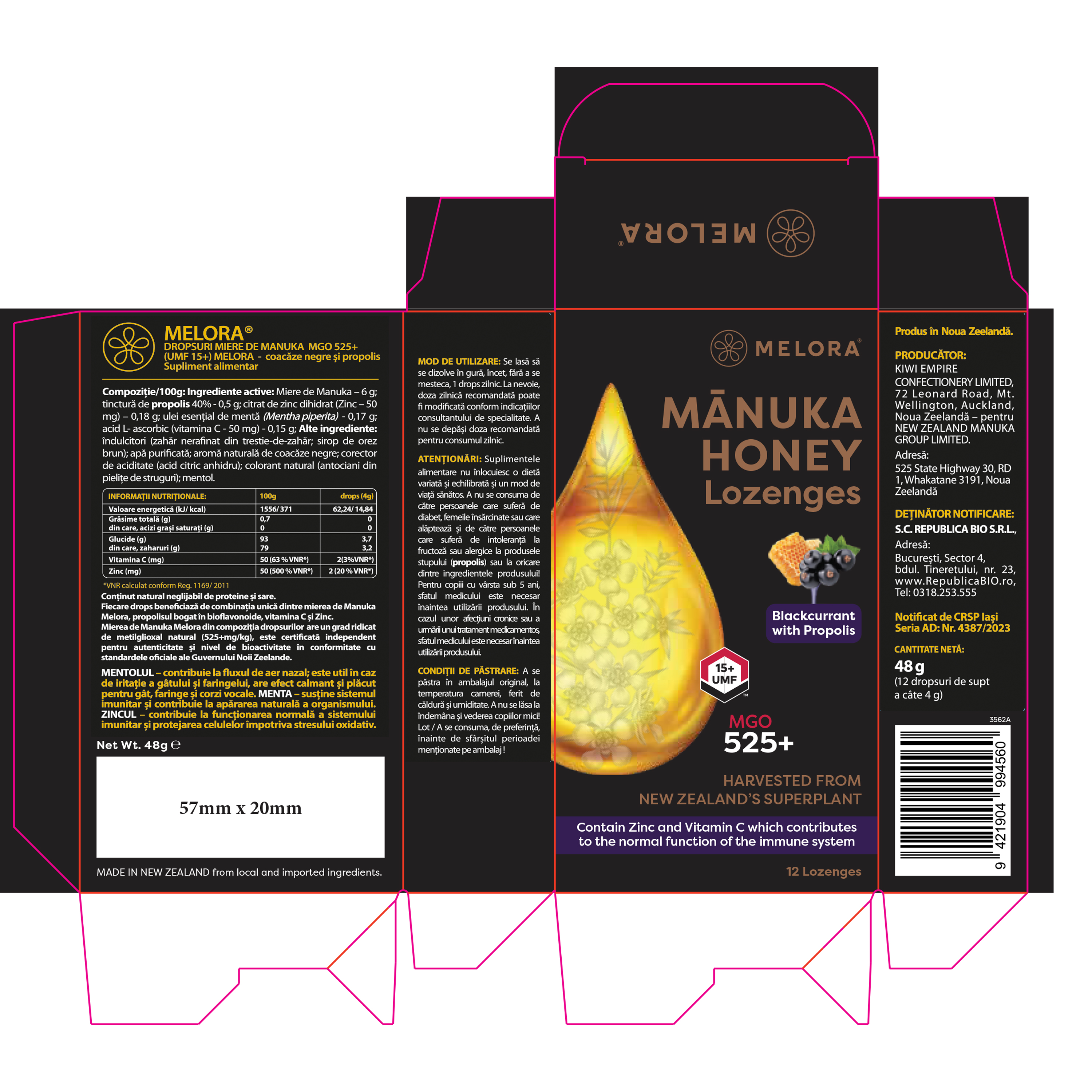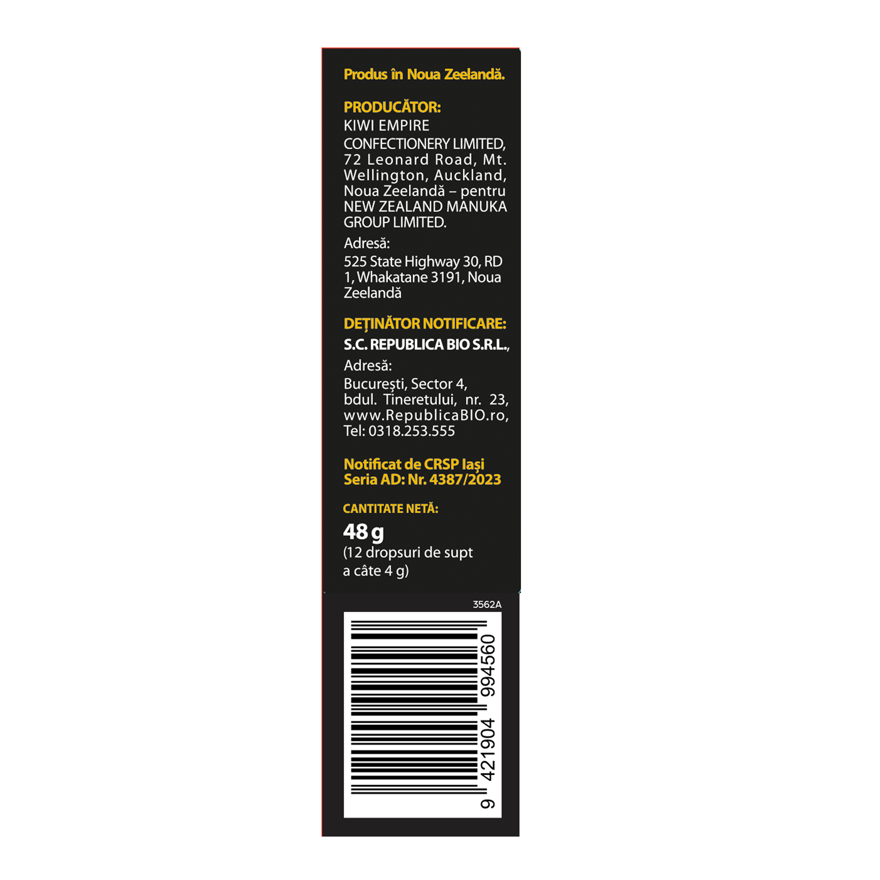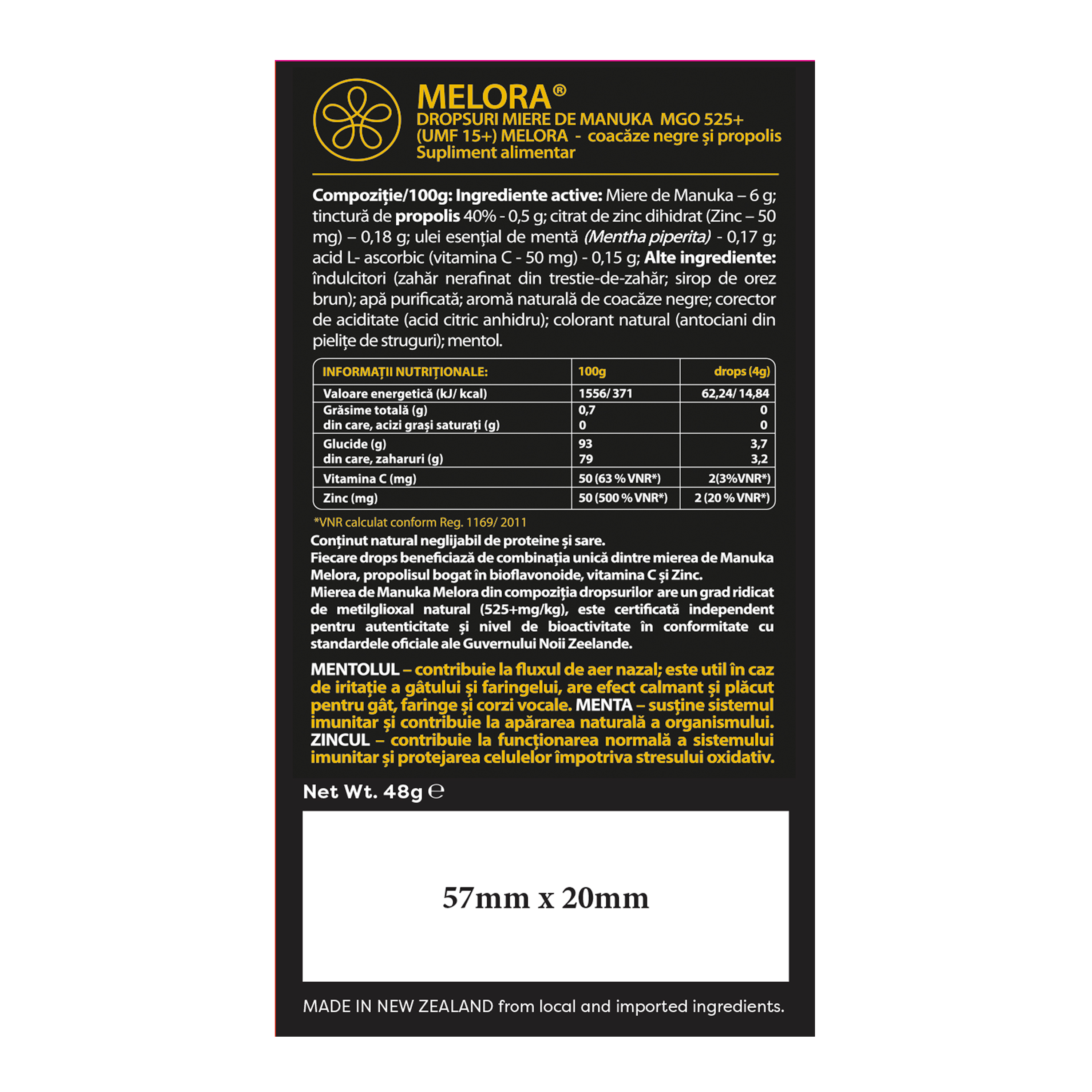 - mierea de Manuka Melora din compozitia dropsurilor are un grad ridicat de metilglioxal natural (525+mg/kg), este certificata independent pentru autenticitate si nivel de bioactivitate in conformitate cu standardele oficiale ale Guvernului Noii Zeelande;