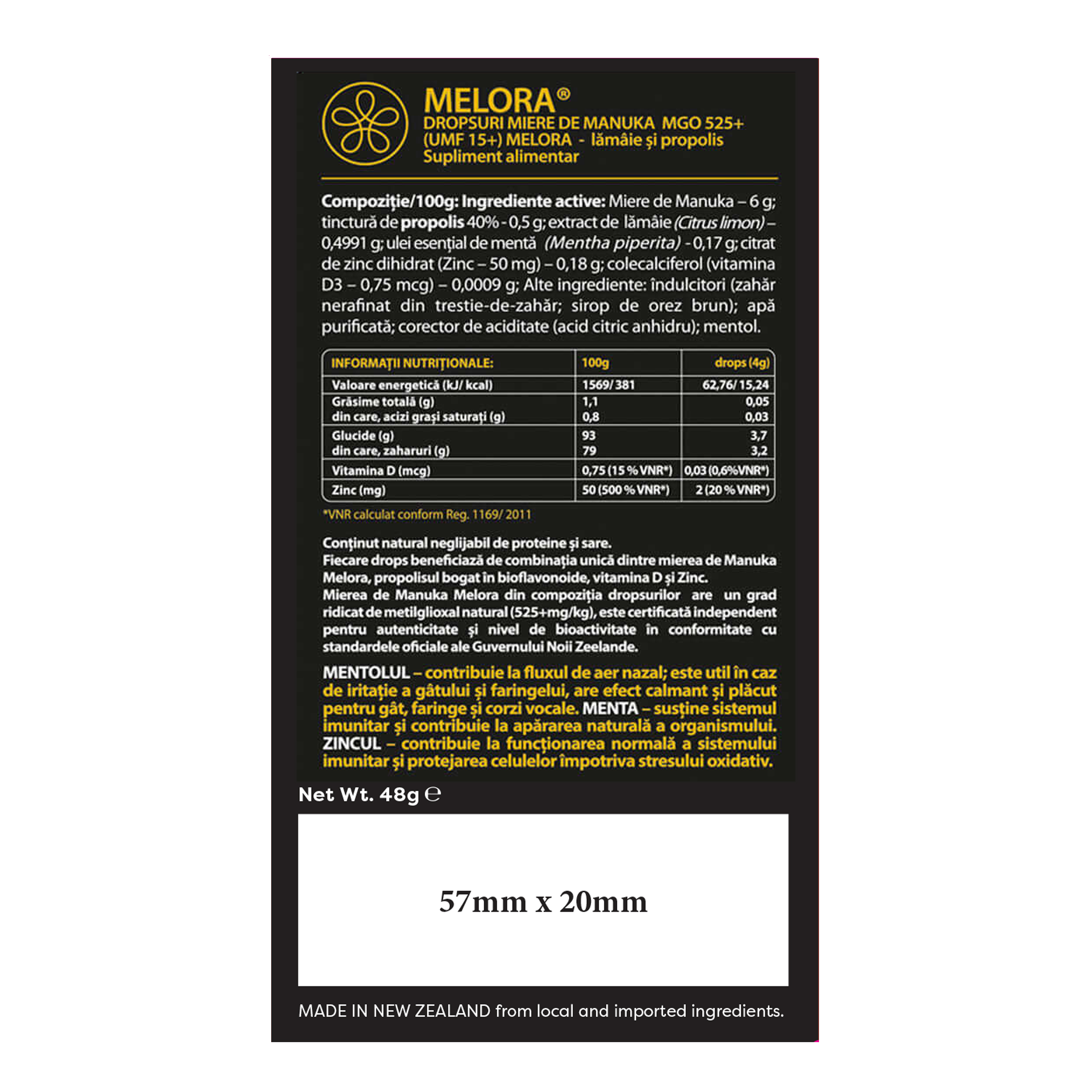 - Fiecare drops beneficiaza de combinatia unica dintre mierea de Manuka Melora, propolisul bogat in bioflavonoide, vitamina C si Zinc.
