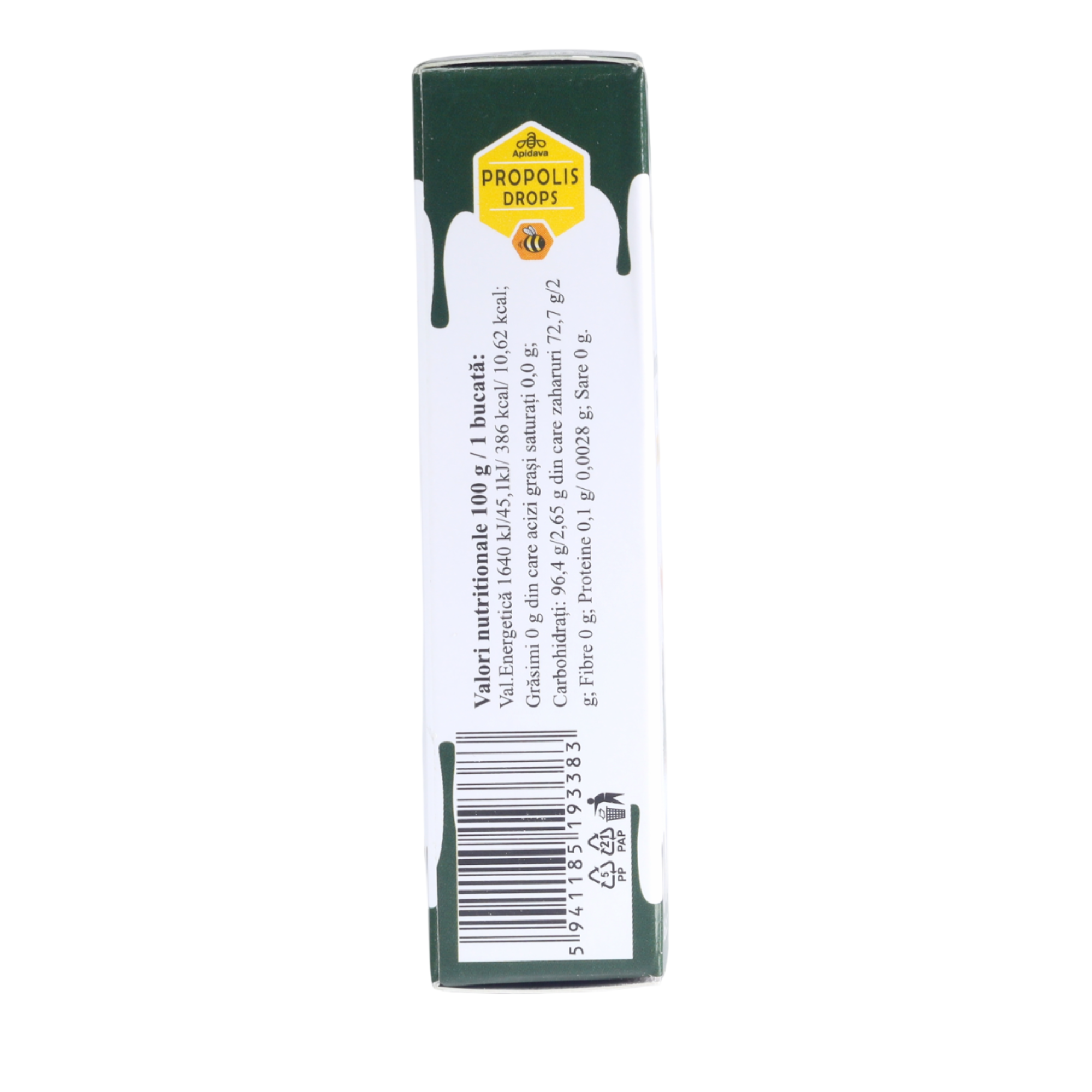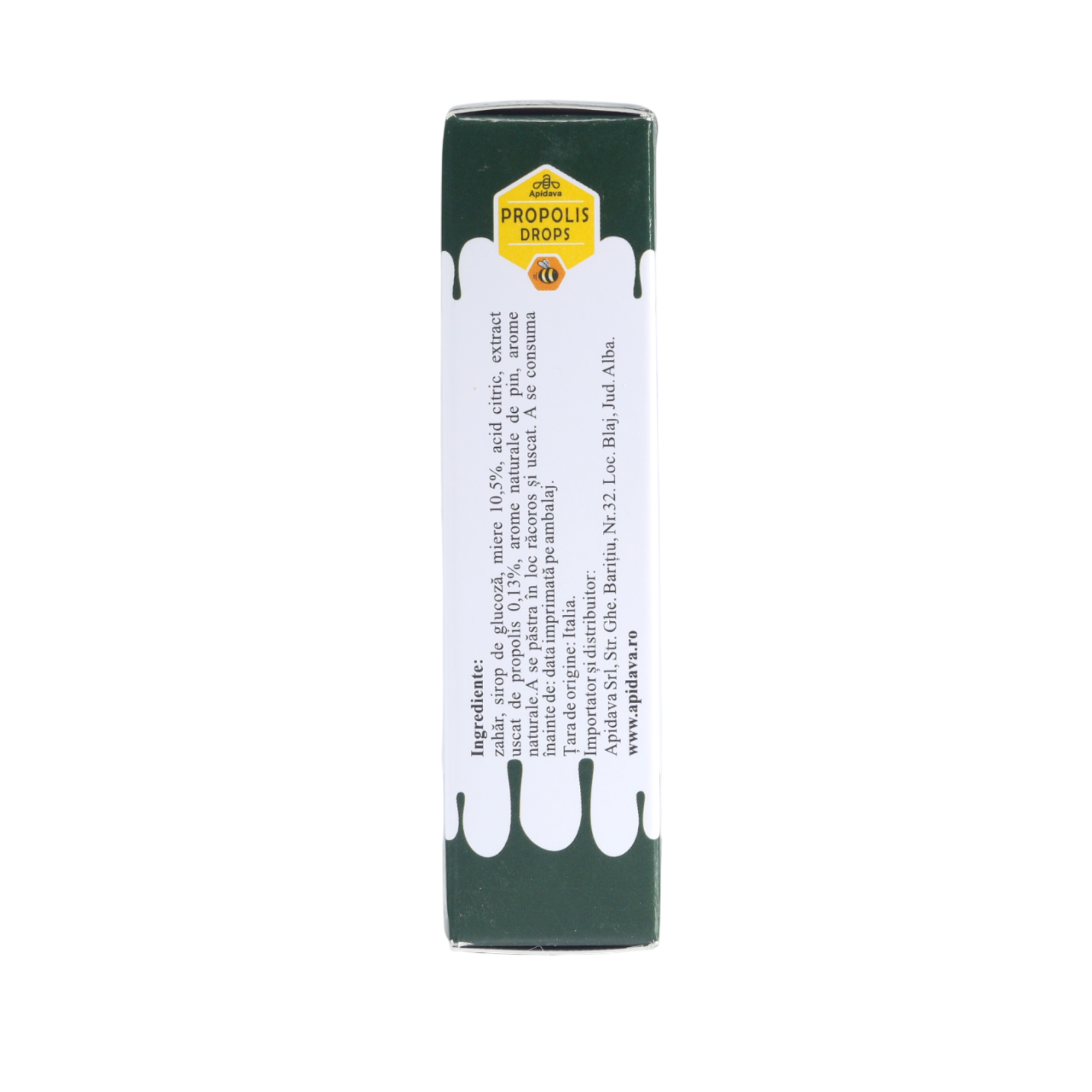 zahăr, sirop de glucoză, miere 10,5%, acid citric, extract uscat de propolis 0,13%, arome naturale de pin, arome naturale.