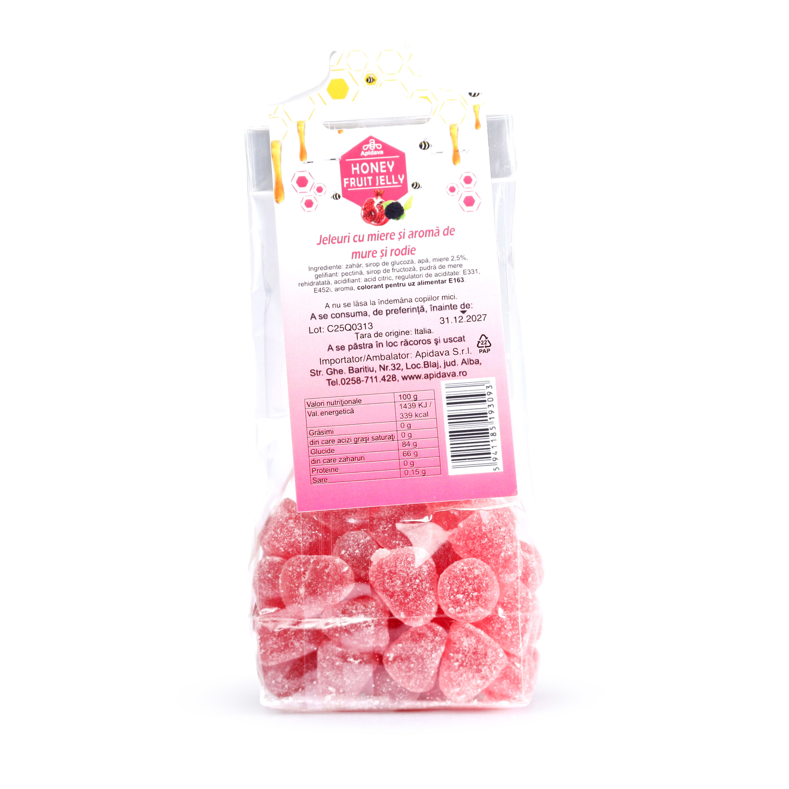 zahăr, sirop de glucoză, apă, miere 2,5%, gelifiant: pectină, sirop de fructoză, pudră de mere rehidratată, acidifiant: acid citric, regulatori de aciditate: E331,E452i, aromă, colorant pentru uz alimentar E163.