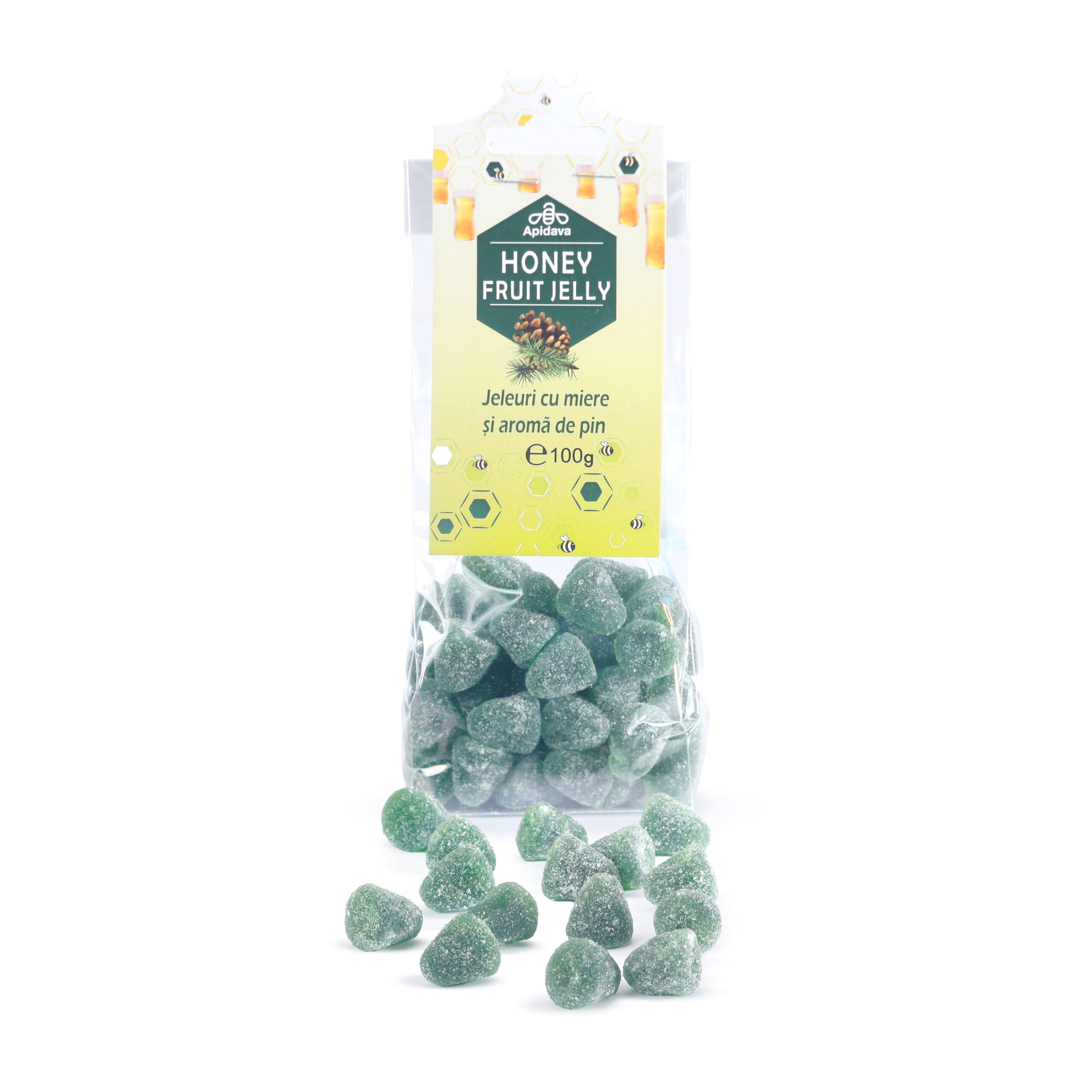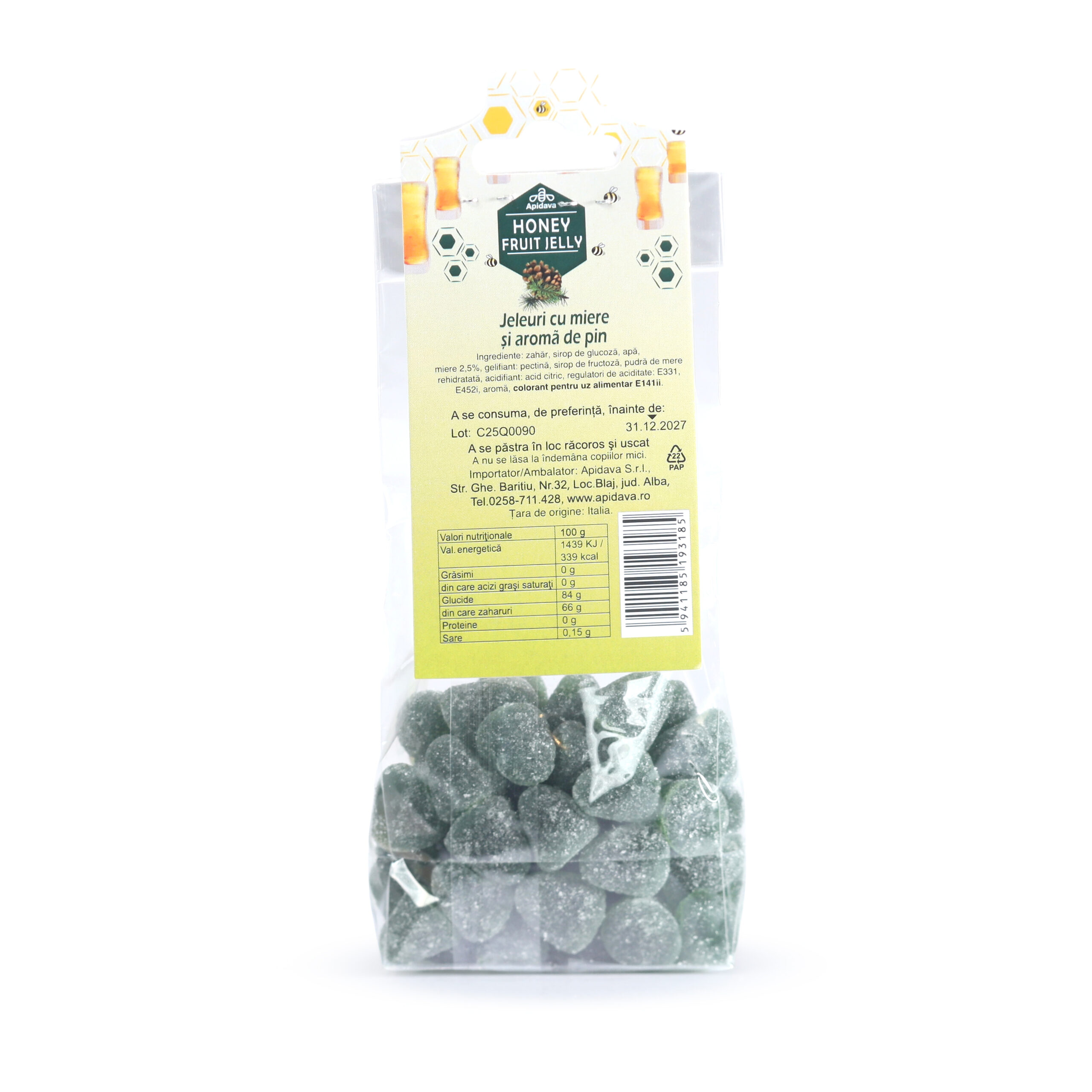 zahăr, sirop de glucoză, apă,miere 2,5%, gelifiant: pectină, sirop de fructoză, pudră de mere rehidratată, acidifiant: acid citric, regulatori de aciditate: E331, E452i, aromă, colorant pentru uz alimentar E141ii.