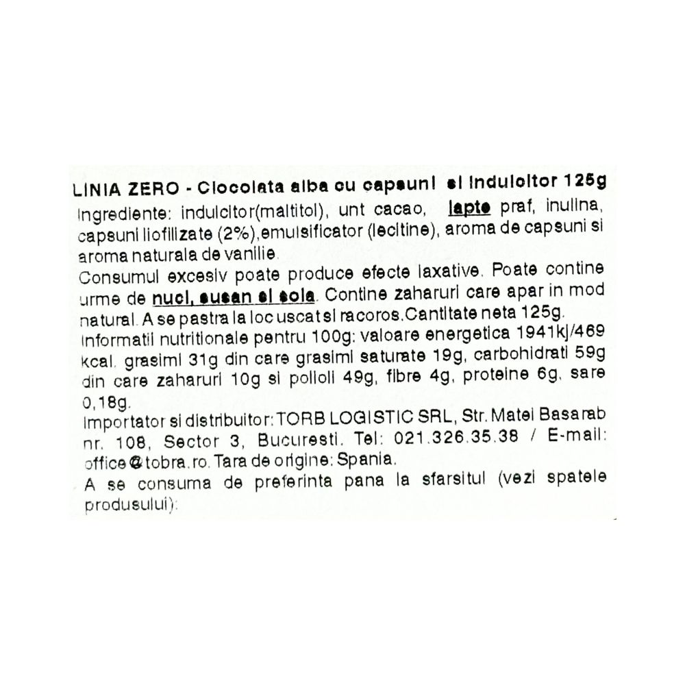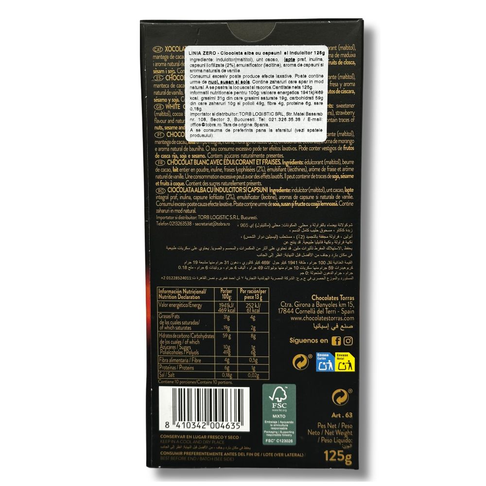 Indulcitor (maltitol), unt cacao, lapte praf, inulina, capsuni liofilizate (2%),emulsificator (lecitina de floarea soarelui) si arome de capsuni si vanilie.