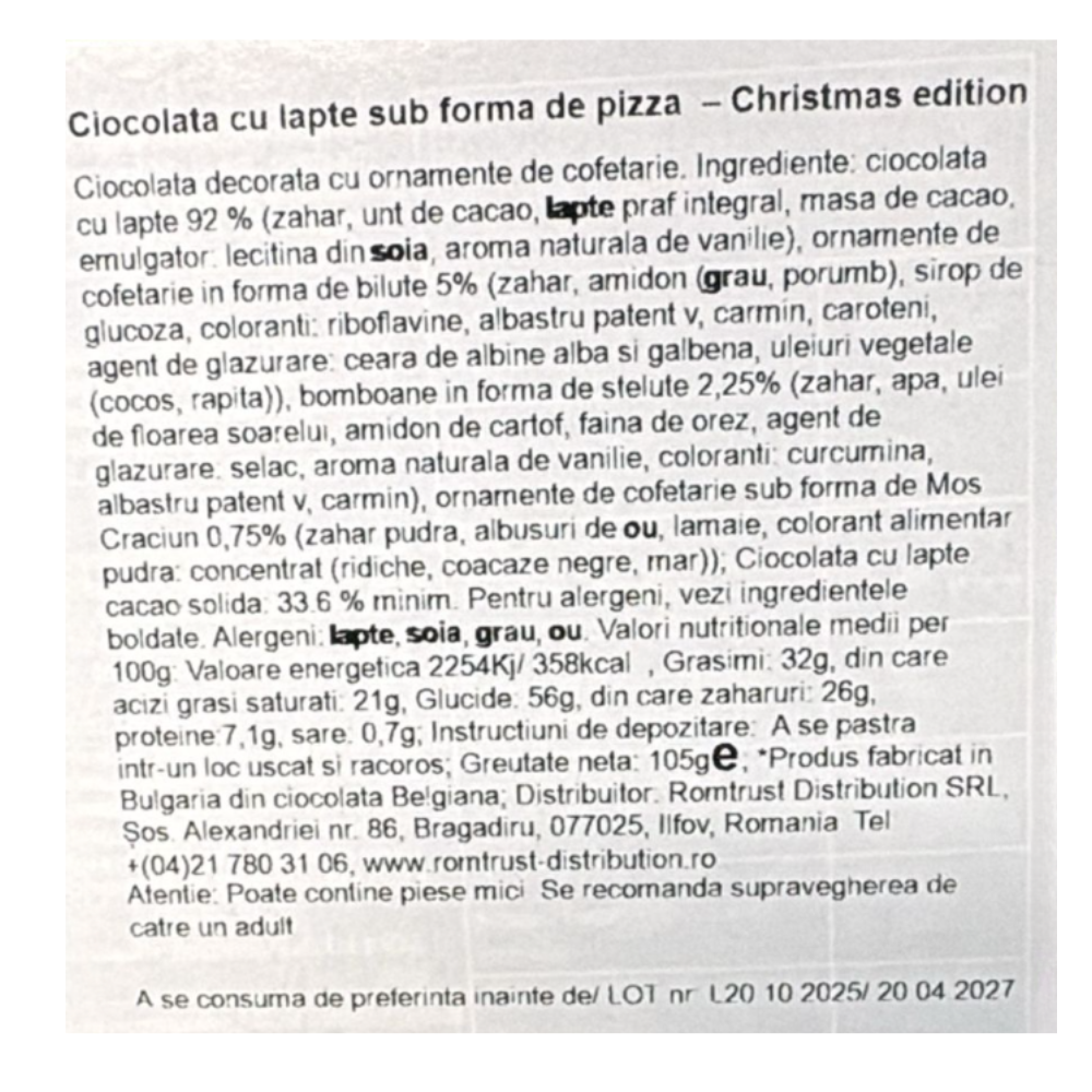 ciocolată cu lapte 92 % (zahăr, unt de cacao, lapte praf integral, masă de cacao, emulgator: lecitină din soia, aromă naturală de vanilie), ornamente de cofetărie în formă de biluțe 5% (zahăr, amidon (grau, porumb), sirop de glucoză, coloranți: riboflavine, albastru patent v, carmin, caroten; agent de glazurare: ceară de albine albă și galbenă, uleiuri vegetale (cocos, rapiță)), bomboane în formă de steluțe 2,25% (zahăr, apă, ulei de floarea soarelui, amidon de cartof, făină de orez, agent de glazurare: șelac, aromă naturală de vanilie, coloranți: curcumină, albastru patent v, carmin), ornamente de cofetărie sub formă de Moș Crăciun 0,75% (zahăr pudră, albușuri de ou, lămâie, colorant alimentar pudră: concentrat (ridiche, coacăze negre, măr));