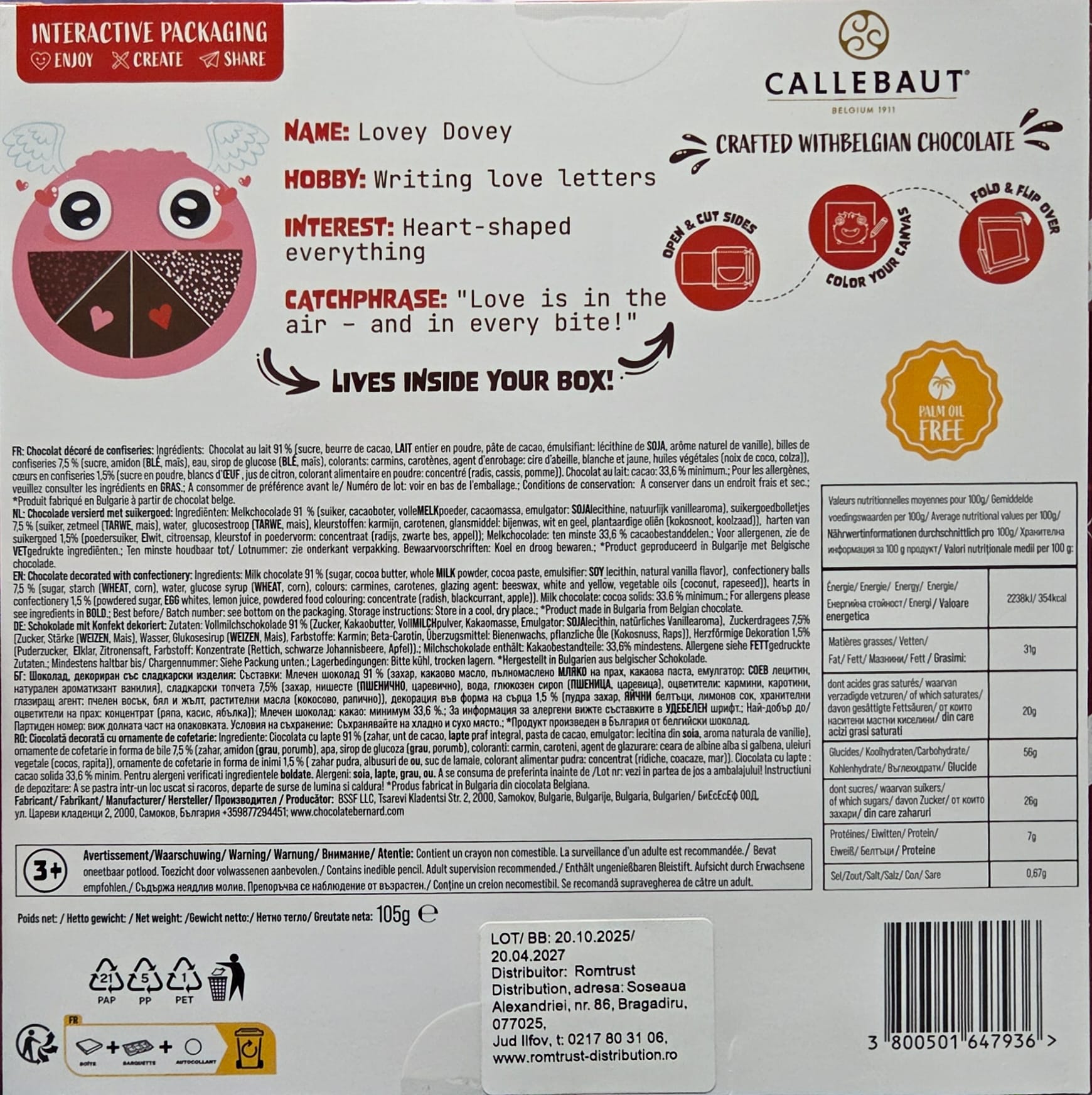 Chocolate Pizza Love Edition este o ciocolată belgiană cu lapte, modelată sub forma unei mini pizza, decorată cu ornamente de cofetărie. Este un cadou inedit și dulce, ideal pentru a celebra momente speciale cu persoanele dragi. Produsul nu conține ulei de palmier.