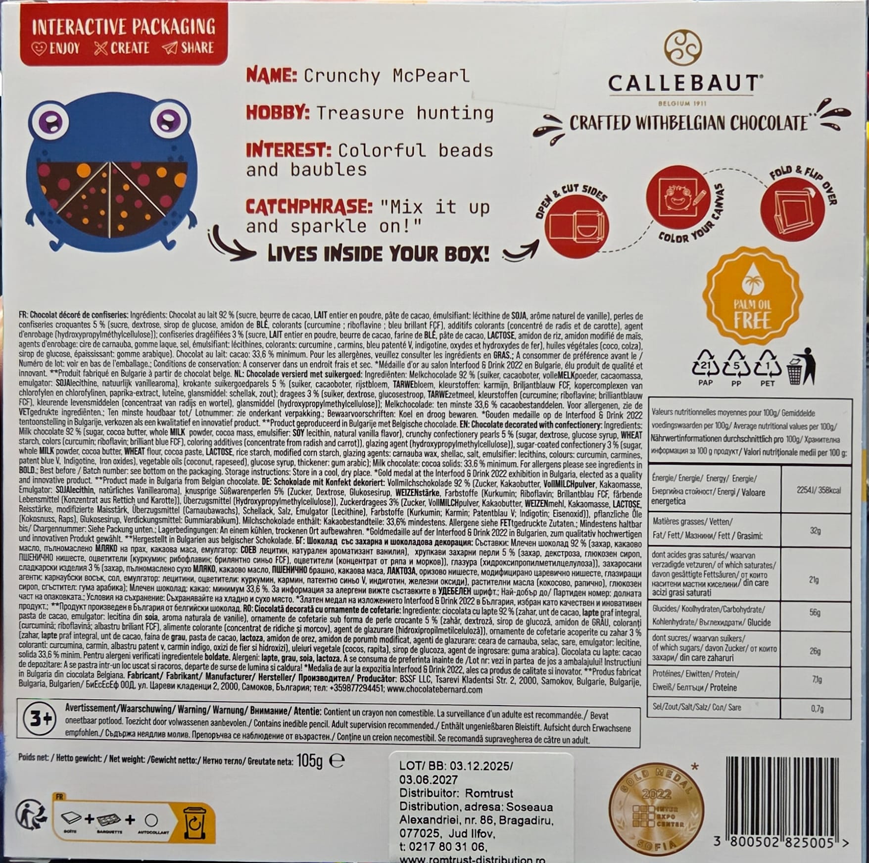 Ingrediente: ciocolata cu lapte 92%(zahar, unt de cacao, lapte praf integral, masa de cacao, emulgator: lecitina din soia, aroma naturala de vanilie), ornamente de cofetarie sub forma de perle crocante 5%”( zahar, dextroza,sirop de glucoza, amidon de grau, coloranti (curcumina, riboflavine, albastru briliant FCF), aditivi de colorare (concentrat din ridiche si morcov), agent de glazurare (hidroxipropilmetilceluloza)), ornamente de cofetarie acoperite cu zahar 3%( zahar, lapte praf integral, unt de cacao, faina de grau , pasta de cacao, lactoza , amidon de orez, amidon de porumb modificat, agenti de glazurare: ceara de carnauba – selac, sare, emulgator: lecitine, coloranti: curcumina, carmin, albastru patent v, carmin indigo, oxizi de fier si hidroxizi), uleiuri vegetale (cocos, rapita), sirop de glucoza, agent de ingrosare: guma arabica). Ciocolata cu lapte: cacao solida 33,6% minim. Pentru alergeni verificati ingredientele boldate. Alergeni :lapte, soia, grau, lactoza.
