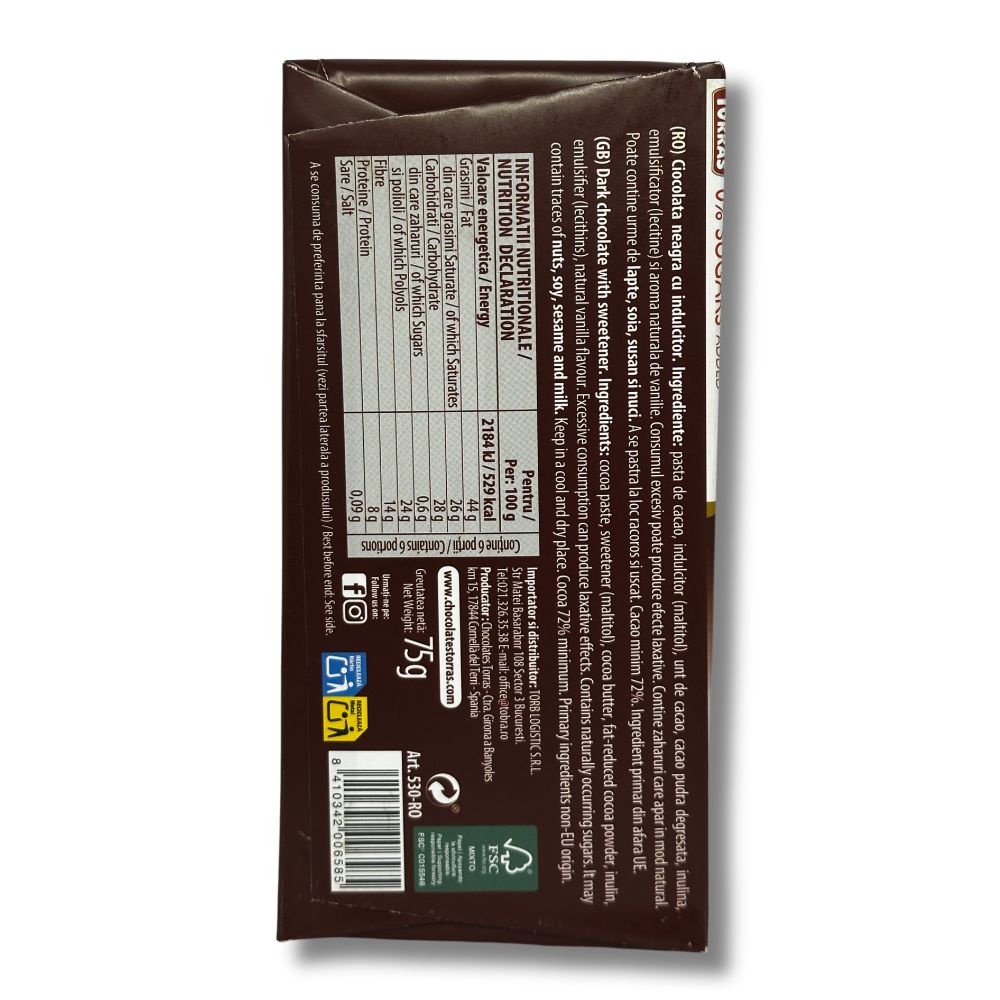 Ciocolata neagră Torras cu 72% cacao oferă un gust intens și echilibrat, fiind o alegere ideală pentru iubitorii de ciocolată cu conținut ridicat de cacao. Îndulcită cu maltitol.