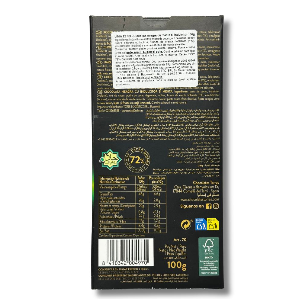 Ciocolata neagră Torras Zero cu 72% cacao și mentă combină gustul intens al cacao-ului cu prospețimea aromată a mentei. Îndulcită cu maltitol.