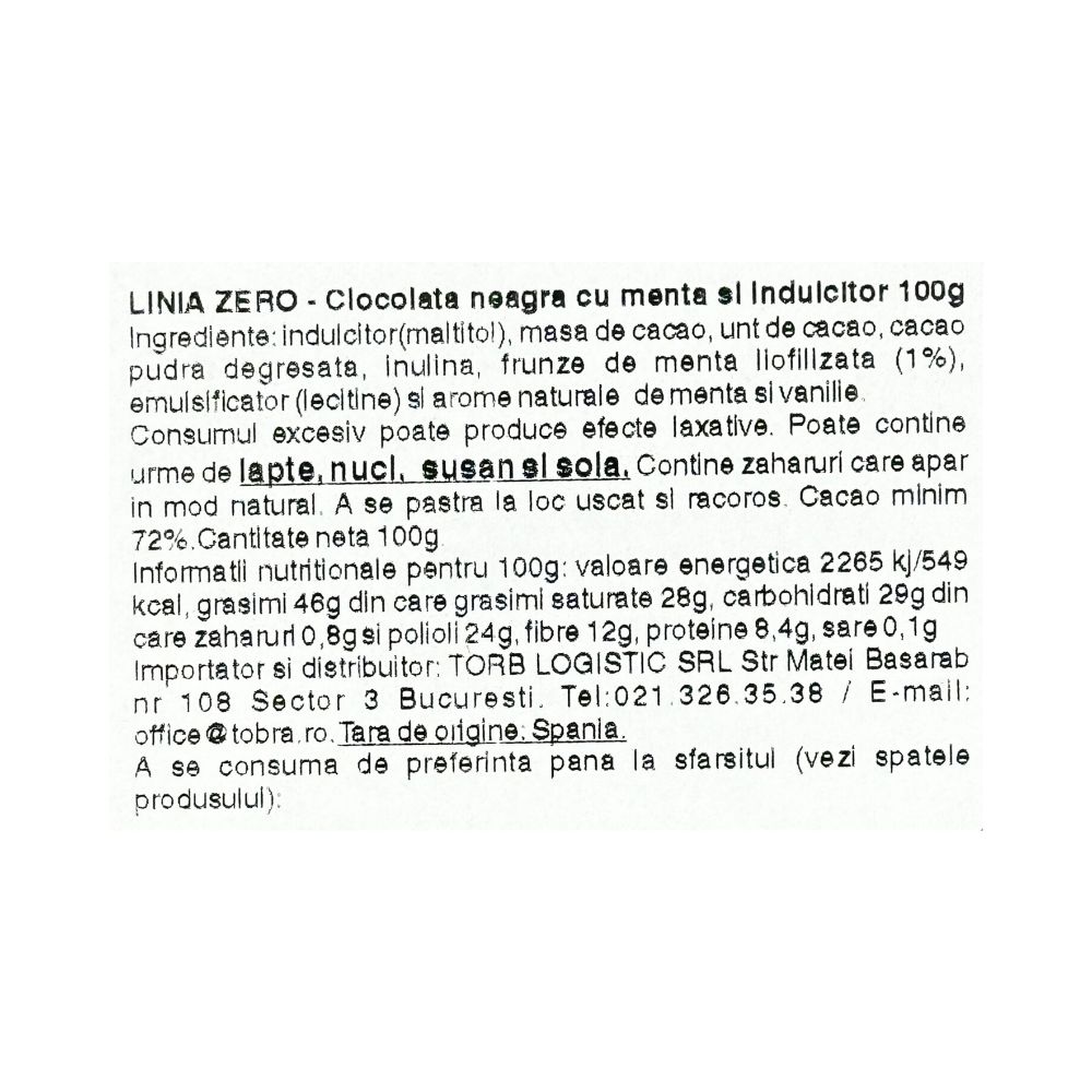 Indulcitor(maltitol), masa de cacao, unt de cacao, cacao pudra degresata, inulina, frunze de menta (3%), emulsificator (lecitina de floarea soarelui) si arome de menta si vanilie. Cacao minim 72%