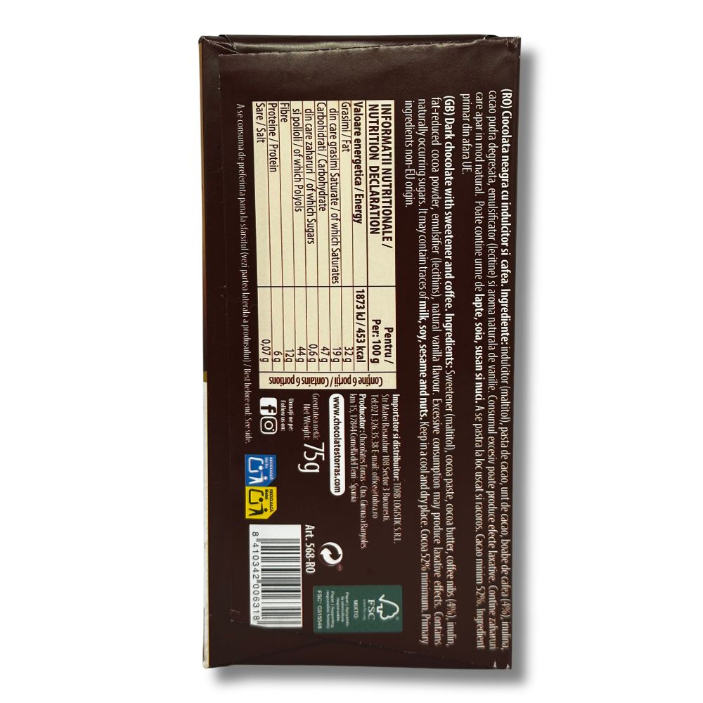 Ciocolata neagră Torras cu cafea combină aroma intensă a cacao-ului cu gustul bogat al boabelor de cafea, oferind o experiență plină de savoare. Produsul este îndulcit cu maltitol, fiind o alternativă fără zahăr, potrivită pentru cei care doresc să reducă aportul de zahăr.
