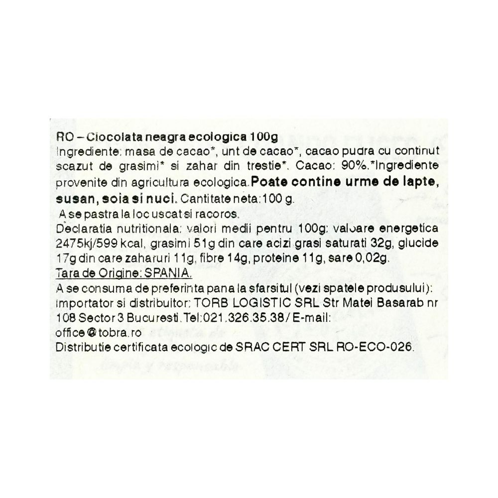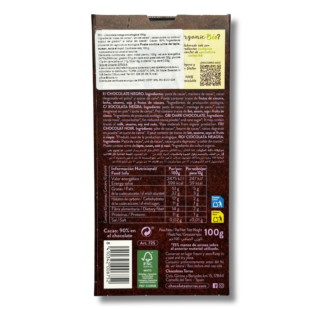 Ciocolata neagră ecologică Torras cu 90% cacao oferă o experiență intensă și rafinată pentru iubitorii de ciocolată cu conținut ridicat de cacao. Realizată din ingrediente provenite din culturi ecologice,