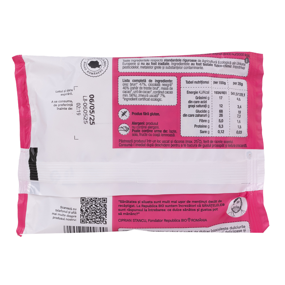 ciocolată neagră* 47% (zahar de trestie brut*, masa de cacao*, unt de cacao*, continut cacao min. 56%), orez brun* 45%, zmeura uscata* 7%.