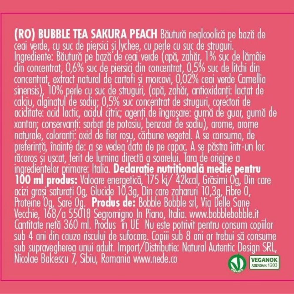 Băutură pe bază de ceai verde (apă, zahăr, 1% suc de lămâie din concentrat, 0,6% suc de piersici din concentrat, 0,5% suc de litchi din concentrat, extract natural de cartofi și morcovi, 0,02% ceai verde Camellia sinensis), 10% perle cu suc de struguri (apă, zahăr, antioxidanți: lactat de calciu, alginatul de sodiu; 0,5% suc concentrat de struguri, corectori de aciditate: acid lactic, acid citric; agenți de îngroșare: gumă de guar, gumă de xantan; conservanți: sorbat de potasiu, benzoat de sodiu), arome, arome naturale, coloranți: oxid de fier roșu, cărbune vegetal.