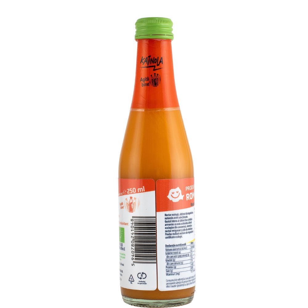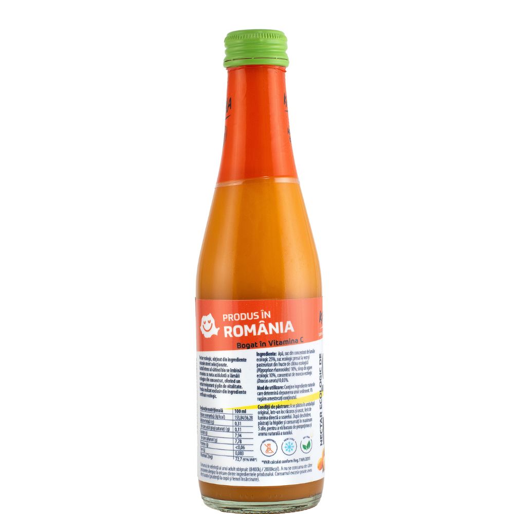 Nectar ecologic, obținut din ingrediente naturale atent selecționate. Gustul intens al cătinei bio se îmbină armonios cu nota acidulată a lămâii ecologice din concentrat, oferind un nectar revigorant și plin de vitalitate. Produs realizat exclusiv din ingrediente certificate ecologic.