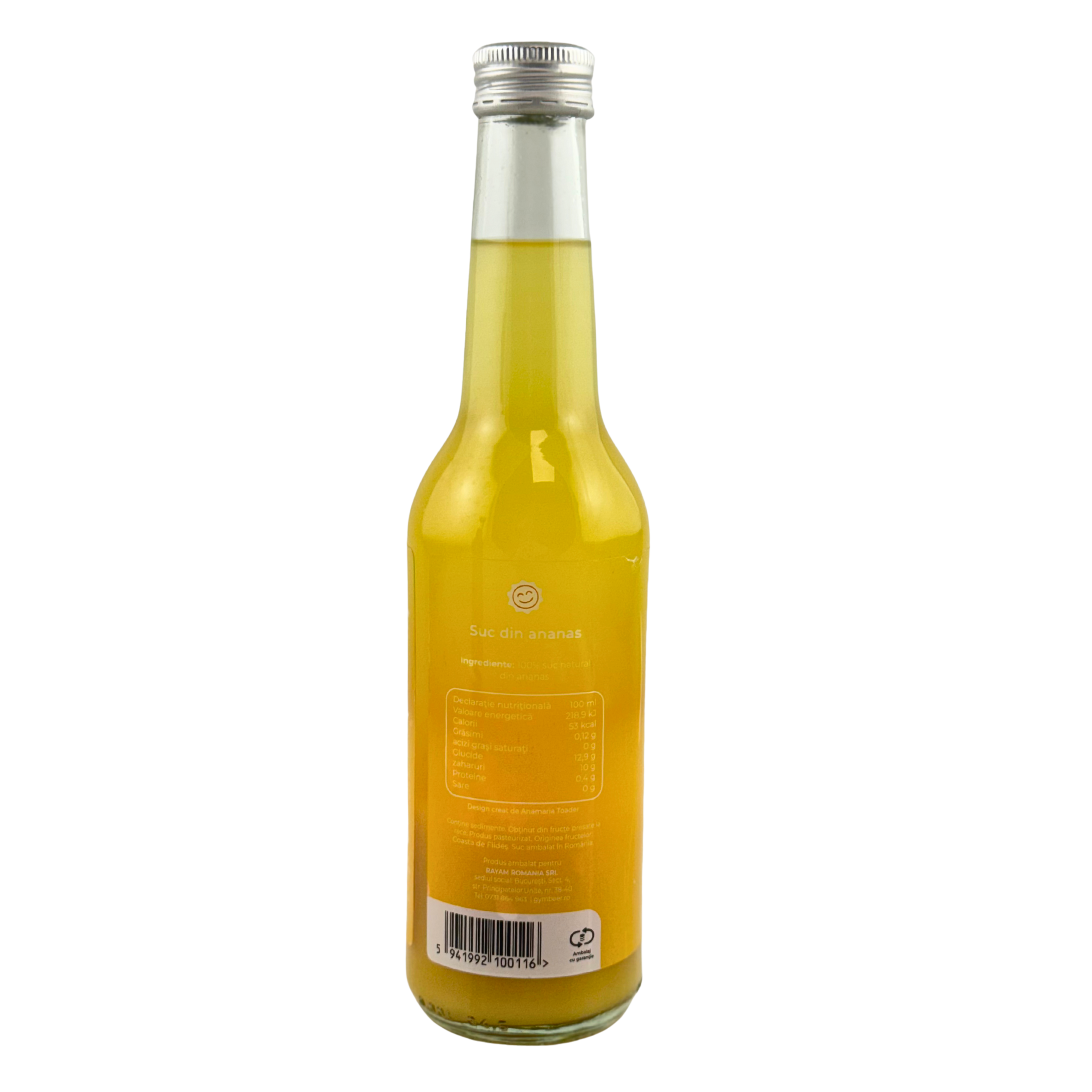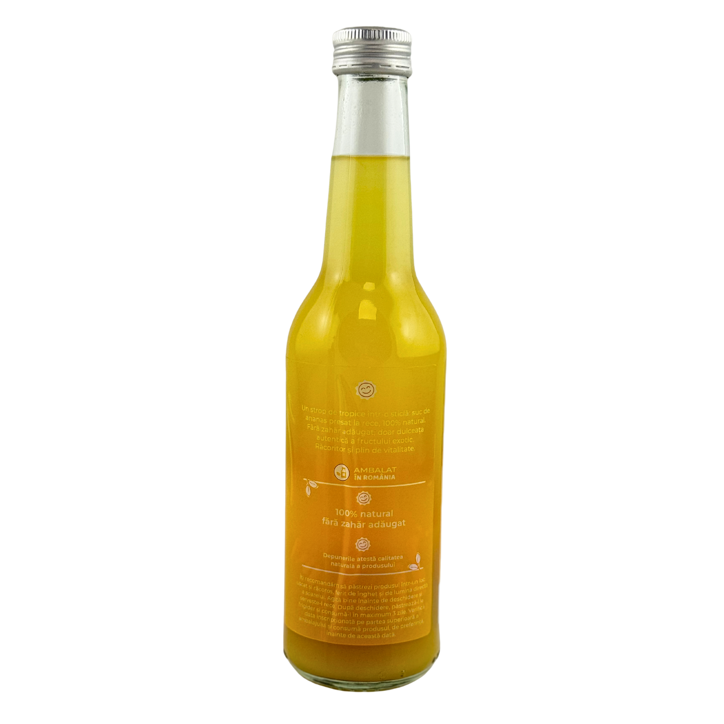 Sucul de Ananas 100% Natural Presat la Rece aduce o doză de prospeÈ›ime tropicală în fiecare sticlă, păstrând aroma autentică È™i dulceaÈ›a naturală a fructului exotic. ObÈ›inut exclusiv din ananas proaspăt, fără adaos de zahăr, coloranÈ›i sau conservanÈ›i, acest suc oferă o experiență pură È™i echilibrată, ideală pentru orice moment al zilei.