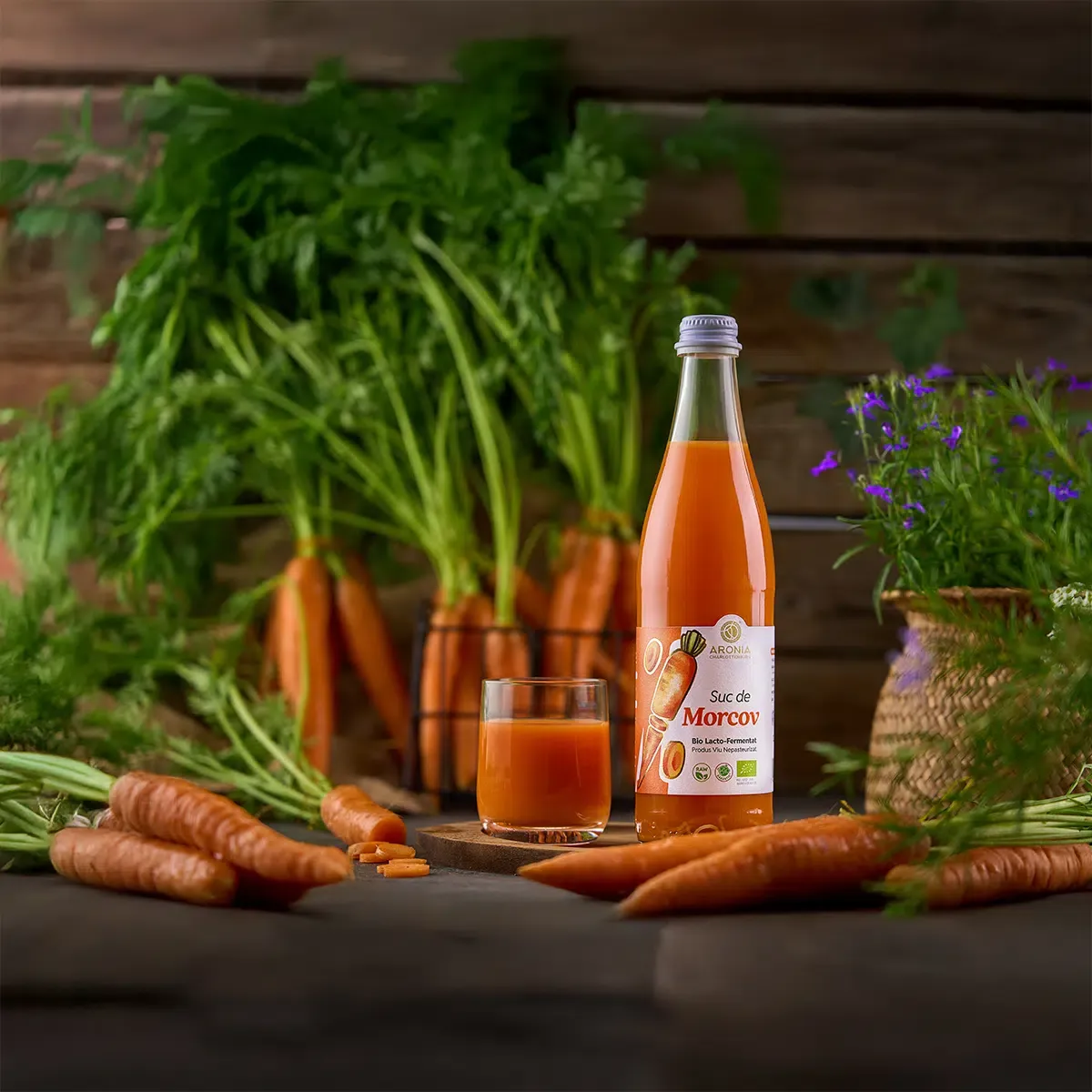 Este un suc pur, fermentat cu acid lactic și degazat, obținut din morcovi ecologici.