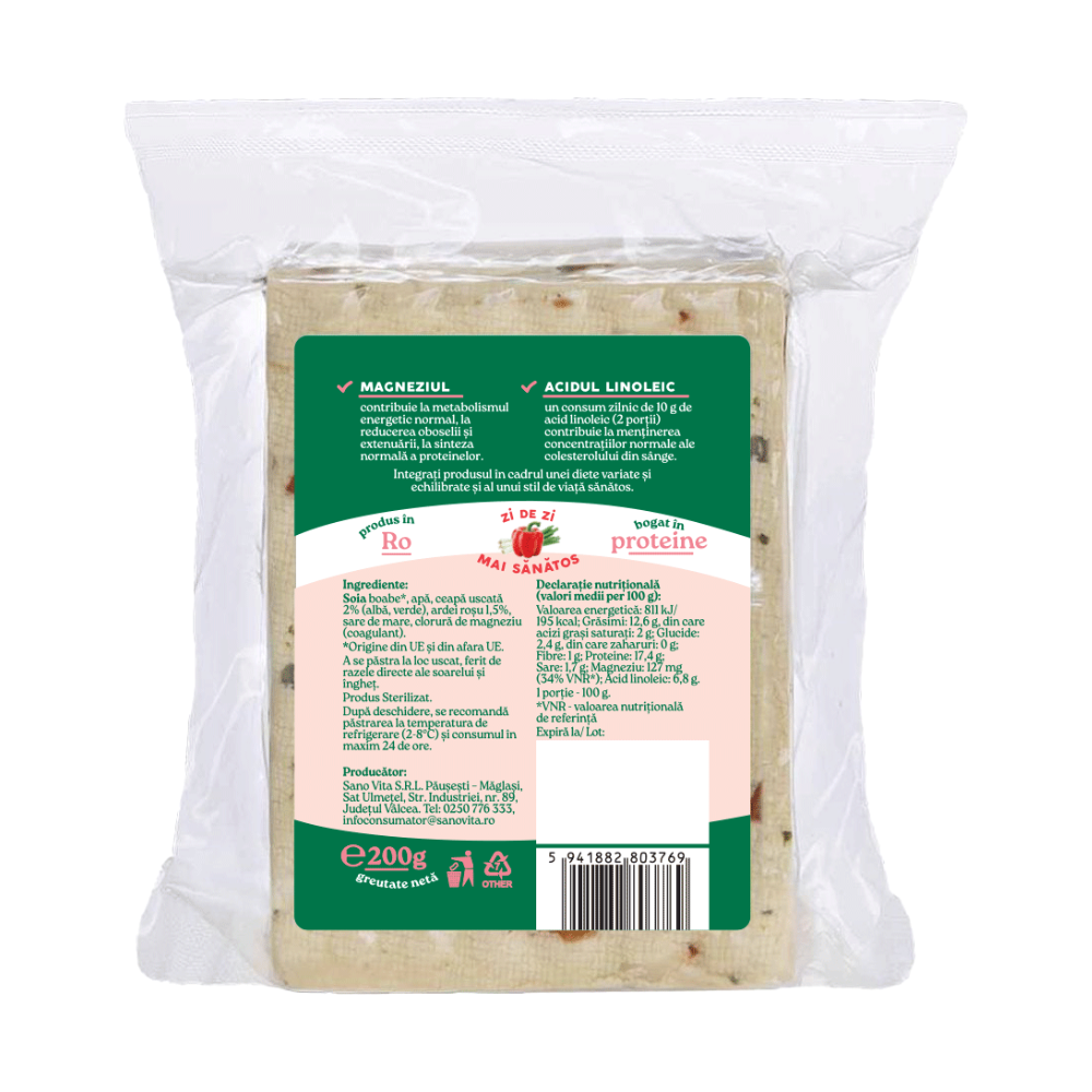 Tofu cu ardei și ceapă sterilizat SanoVita poate fi consumat ca atare sau adăugat în diverse rețete calde sau reci. Produs sterilizat, se păstrează la temperatura camerei.