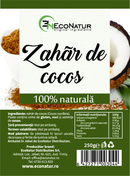 zahăr de cocos (Cocos nucifera). Poate conține urme de gluten, nuci și semințe de susan.