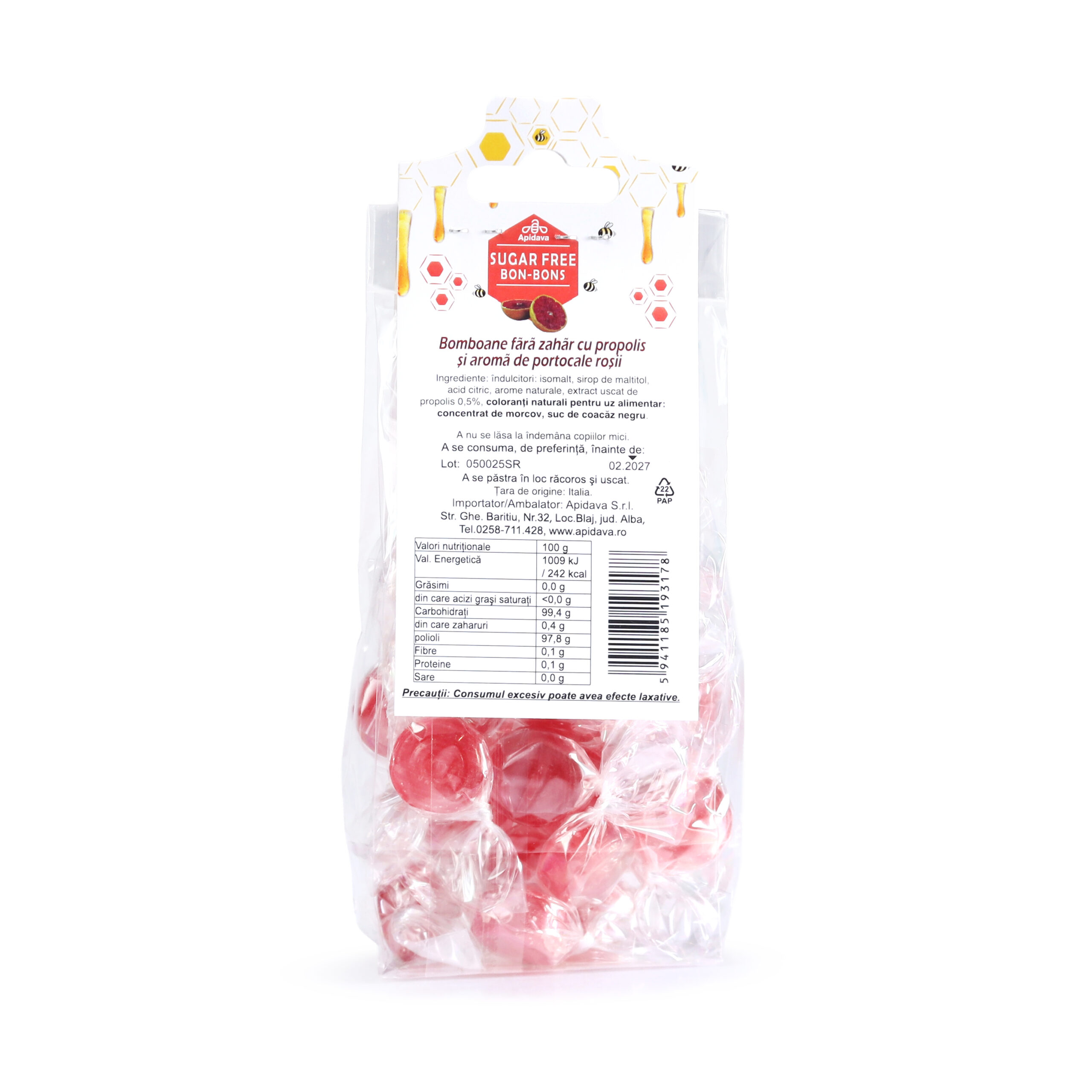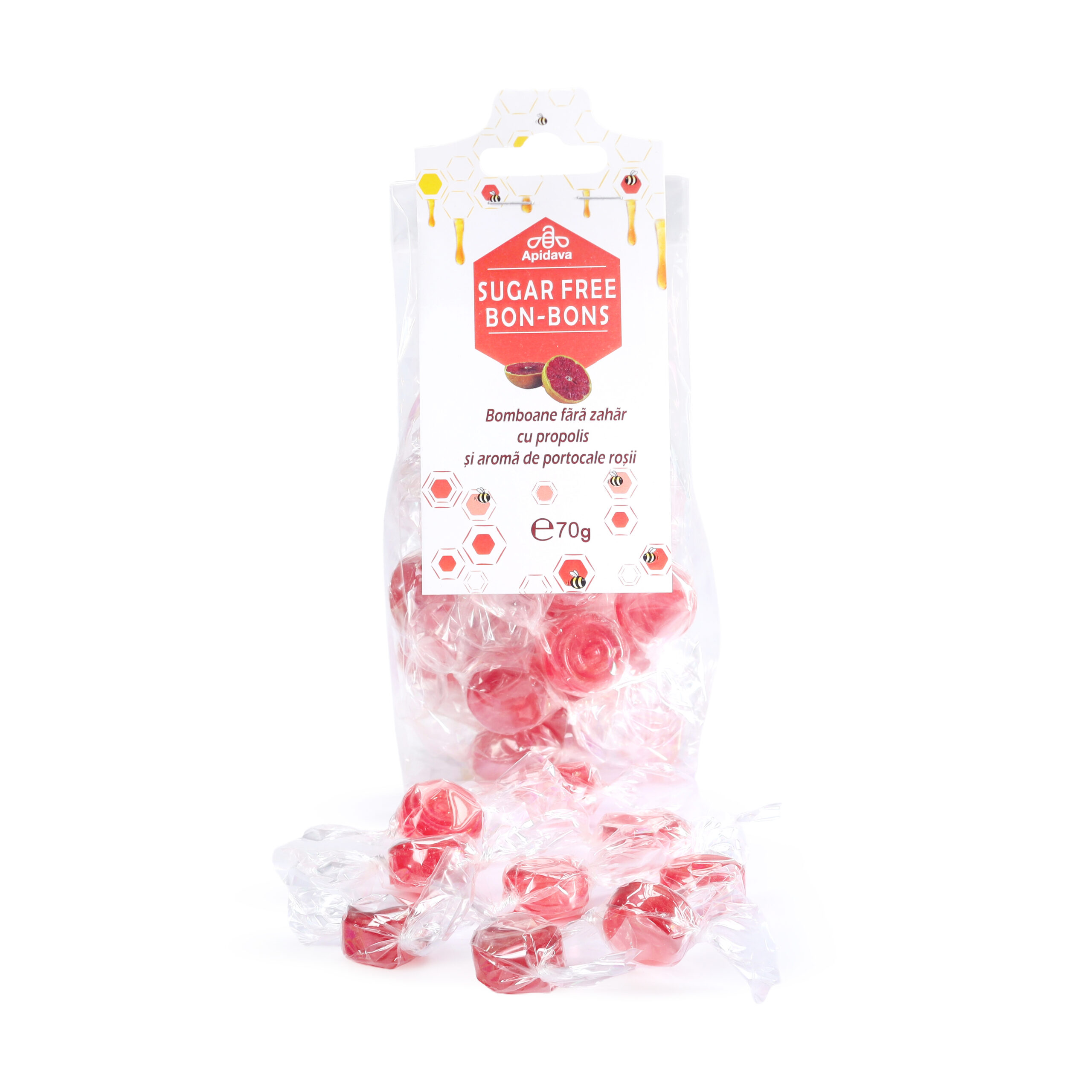 Bomboane fără zahăr, ambalate individual, cu portocale rosii si extract uscat de propolis 0,5%