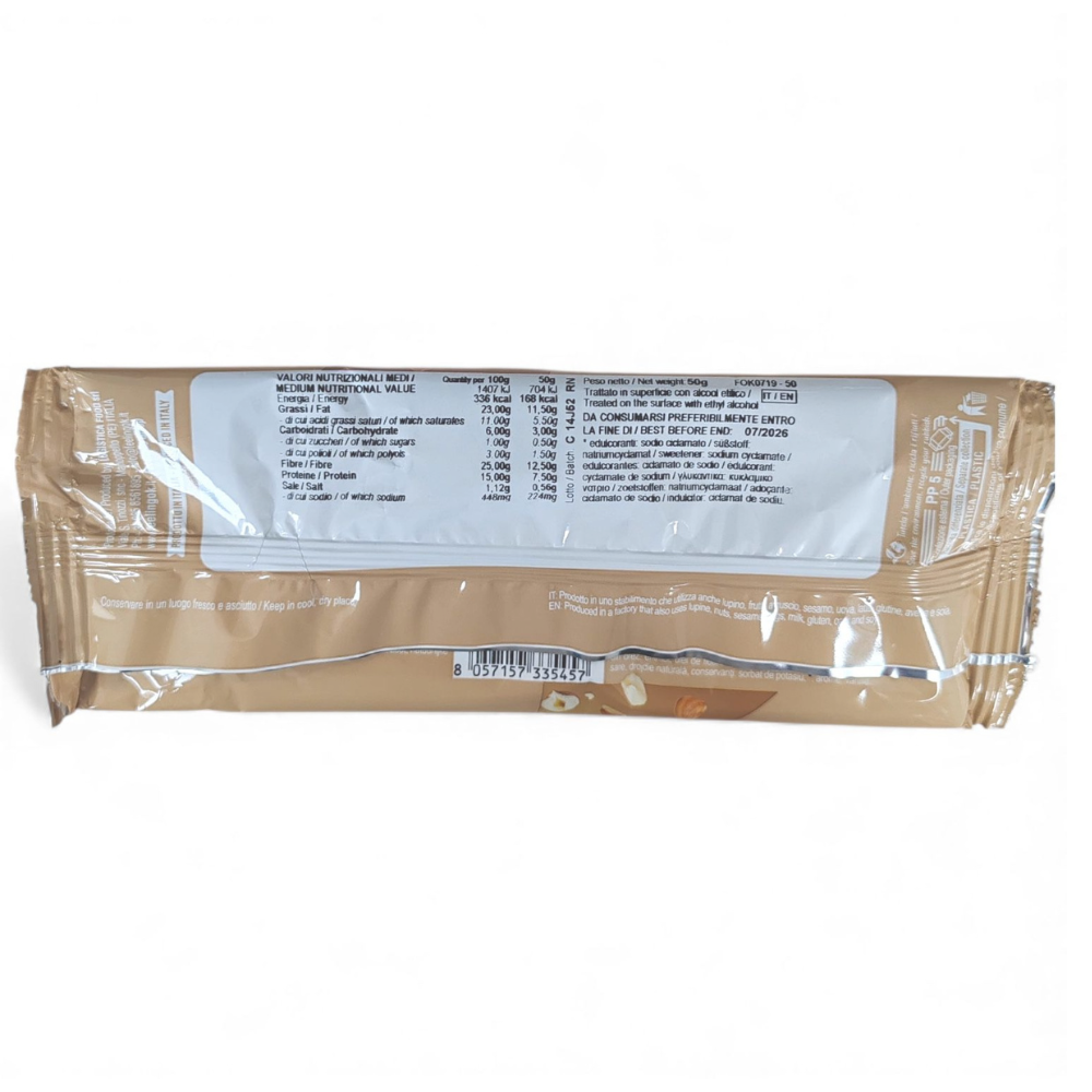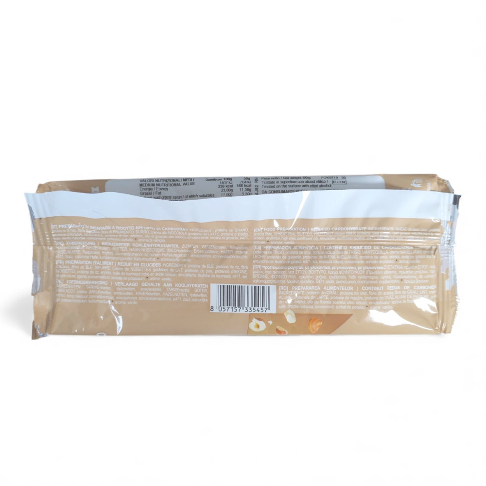 Proteine din grâu (GLUTEN), proteine din orez, fibre de acacia, fibre din grâu (GLUTEN), UNT (LAPTE), cremă de alune de pădure (proteine din lapte, proteine din mazăre, proteine din ovăz, alune de pădure, proteine din orez, eritritol, ulei de floarea-soarelui cu conținut ridicat de acid oleic), emulsificator: lecitină din floarea-soarelui, E471, sare, drojdie naturală, conservant: sorbat de potasiu, îndulcitor: ciclamat de sodiu, arome (vanilie). Tratat la suprafață cu alcool etilic.