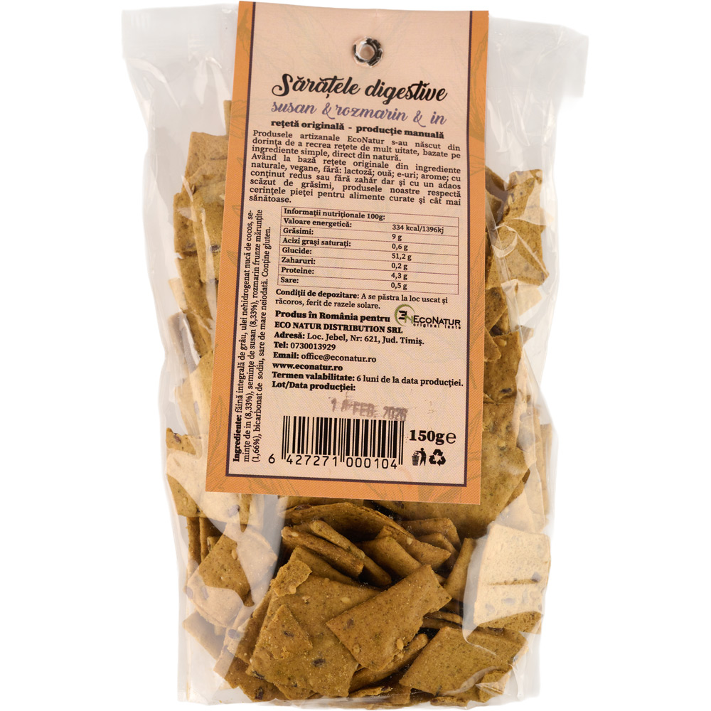 Faina integrala de grau, seminte de susan, seminte de in, rozmarin, sare de mare, ulei nehidrogenat de nuca de cocos, bicarbonat de sodiu. Produsul CONTINE GLUTEN.