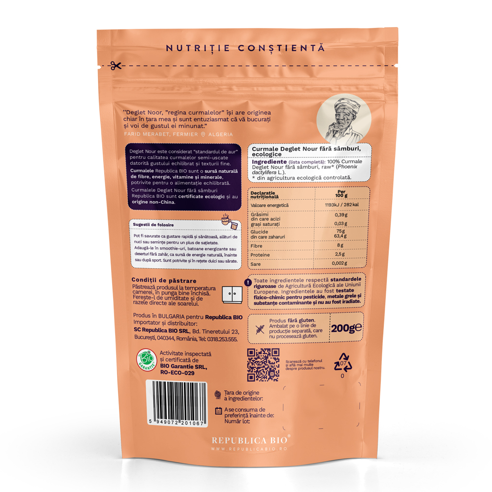 Curmalele Deglet Nour Republica BIO sunt apreciate pentru gustul lor echilibrat și textura semi-uscată, fiind considerate un reper de calitate în categoria curmalelor. Obținute din agricultură ecologică controlată, fără sâmburi și fără adaosuri, acestea pot fi integrate cu ușurință într-o alimentație variată. Produsul este certificat ecologic, fără gluten și potrivit pentru diete vegane.