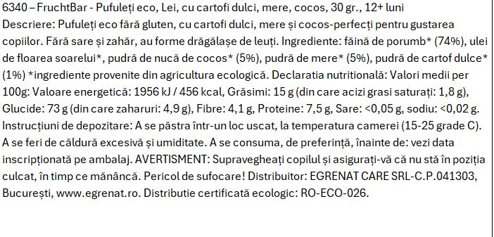 Ultima actualizare a informatiilor de prezentare pentru Pufuleti Bio cu mar, cartofi dulci si nuca de cocos, 30 g, Frucht Bar a fost efectuata la data de 27-04-2026.  |  Raporteaza Descriere Gresita