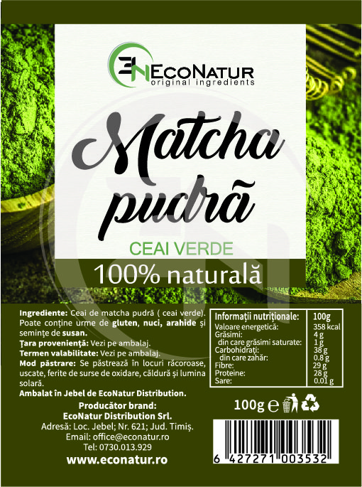 Matcha pudră EcoNatur este o pulbere fină obținută prin măcinarea frunzelor de ceai verde provenite din planta Camellia sinensis. Spre deosebire de ceaiul verde obișnuit, frunzele pentru matcha sunt cultivate la umbră timp de 3-4 săptămâni înainte de recoltare, proces care determină o concentrație crescută de cofeină și L-teanină. Rezultatul este o băutură cu gust autentic, aromă intensă și proprietăți remarcabile pentru sănătate și vitalitate.