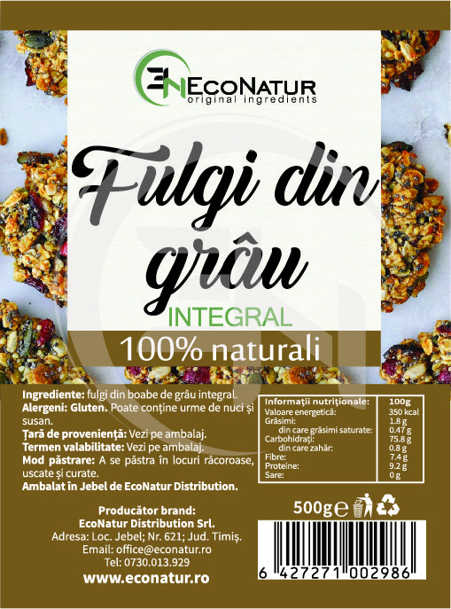 Econatur fulgi de grau integral - contin carbohidrati cu absorbtie lenta din fibre, proteine, substante minerale si vitamine
