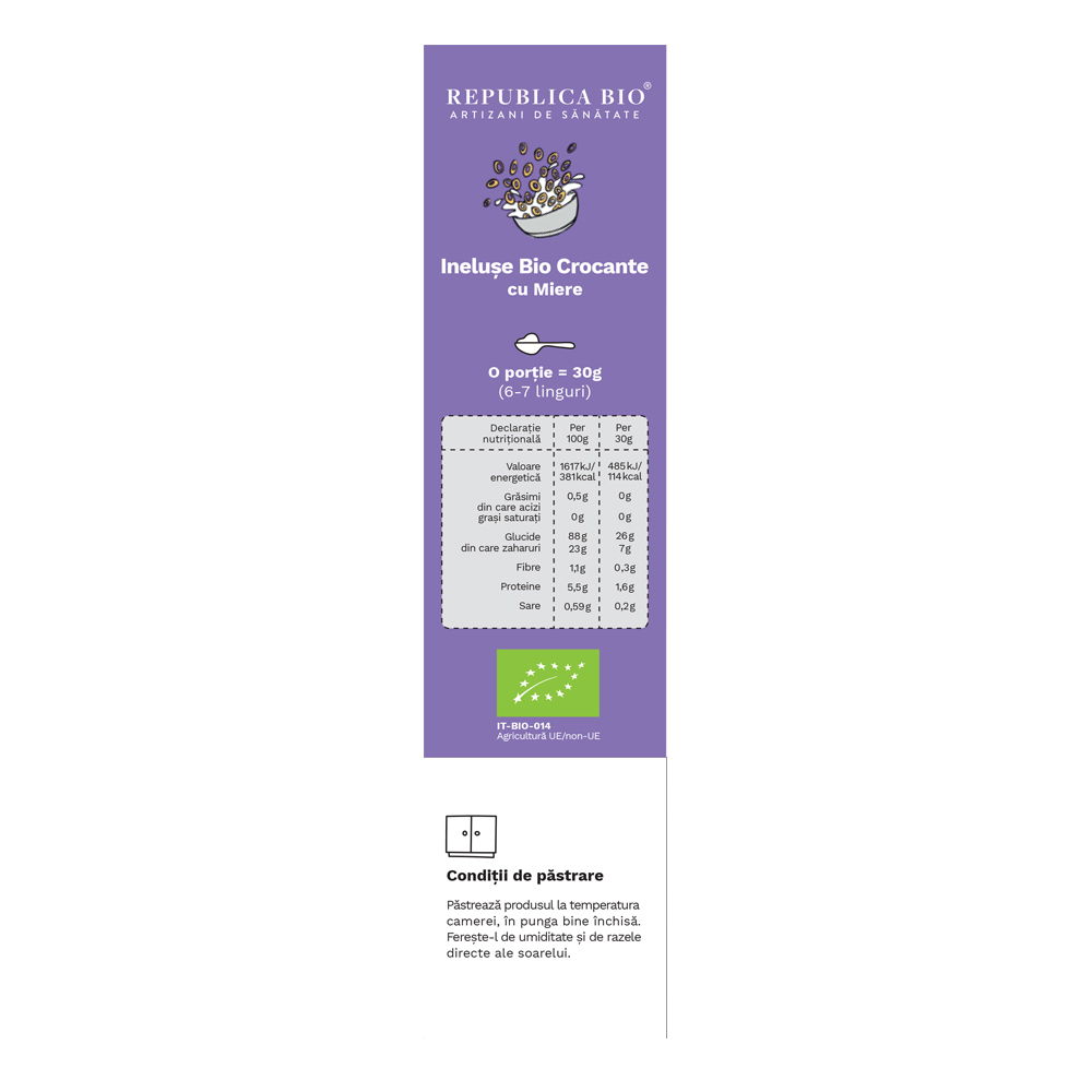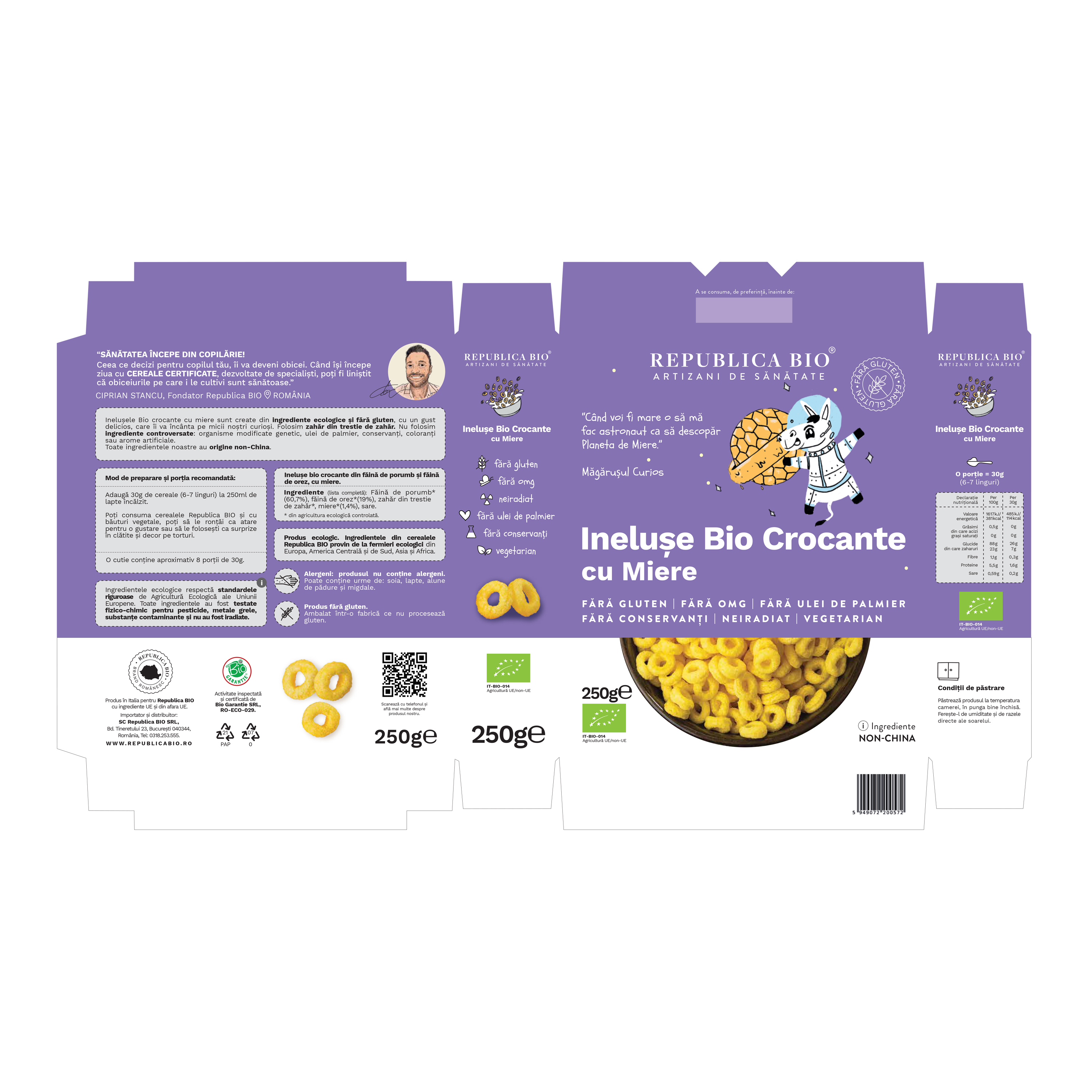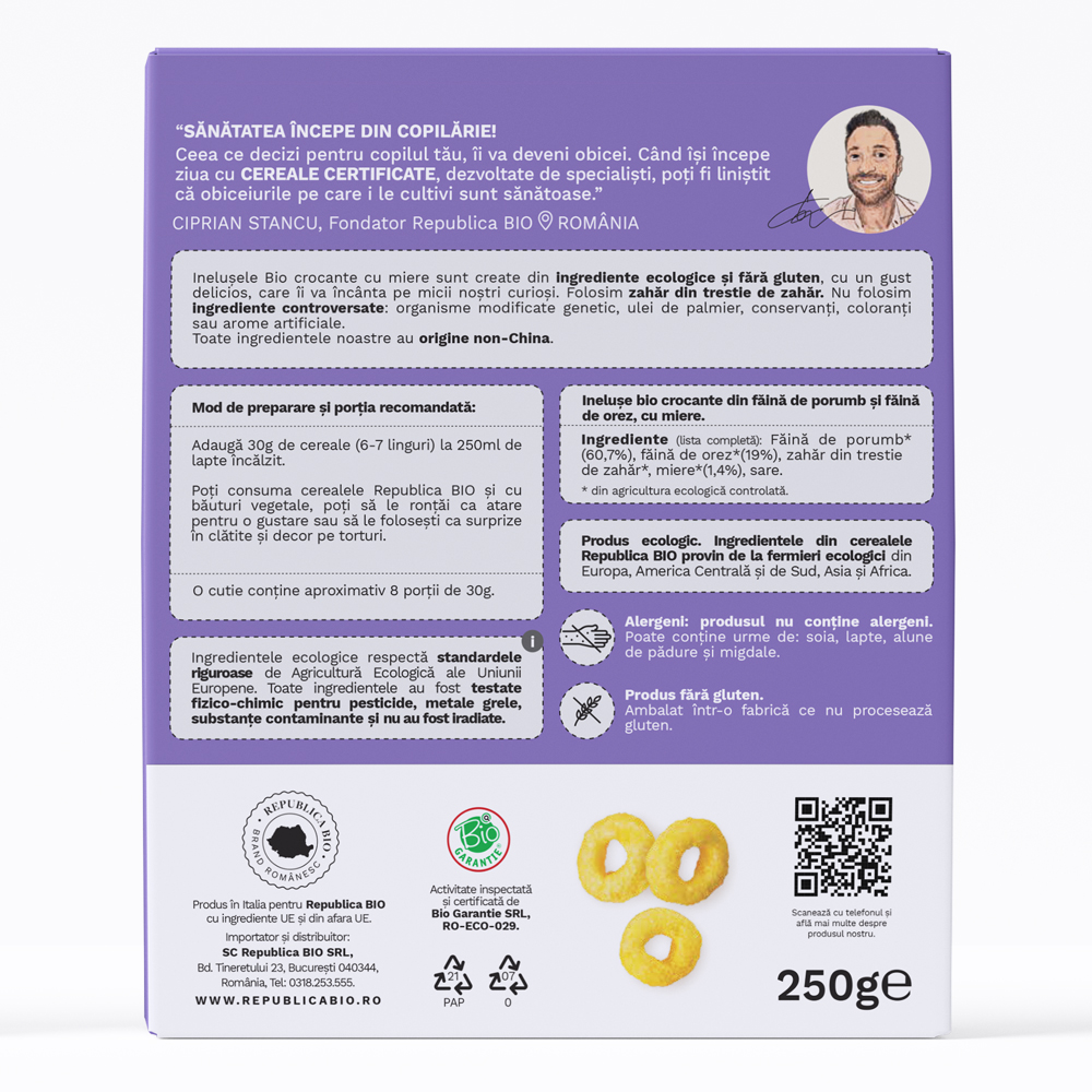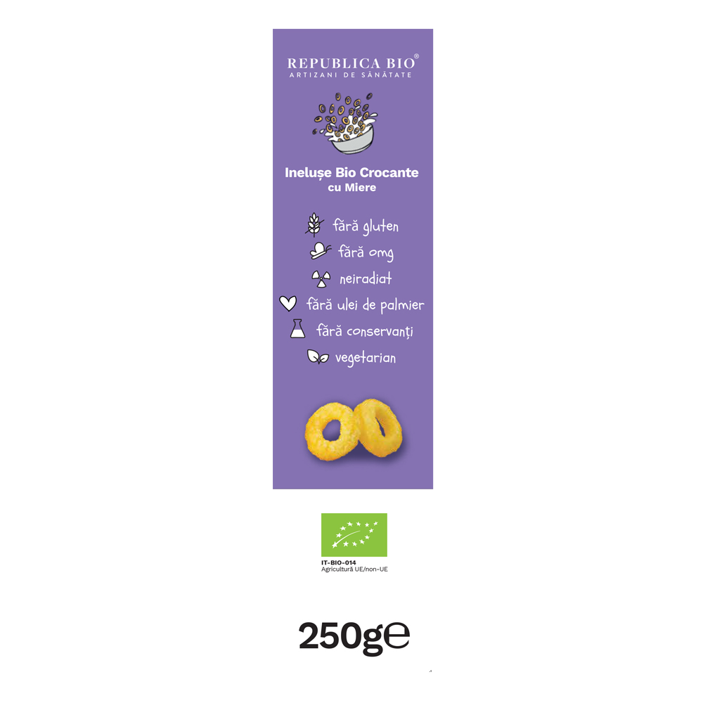 nelușele Bio crocante cu miere, de la Republica BIO, sunt cereale ecologice fără gluten, create special pentru un mic dejun delicios și echilibrat, potrivit atât pentru copii, cât și pentru adulți. Realizate din făină de porumb și făină de orez, cu adaos de miere, aceste inelușe oferă o textură crocantă și un gust plăcut, fără ingrediente controversate.