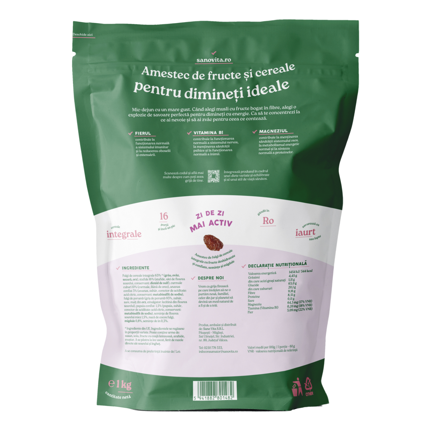 Musli cu fructe de la SanoVita este un amestec de cereale integrale și fructe uscate, ideal pentru dimineți active și pline de vitalitate. Cu 16 porții per pachet, acest musli bogat în fibre, fier, vitamina B1 și magneziu contribuie la un stil de viață sănătos și echilibrat. Este alegerea perfectă pentru cei care își doresc un mic-dejun hrănitor, gustos și natural.