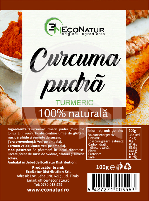 Curcuma/turmeric pudră (Curcuma longa Linnaeus). Poate conține urme de gluten, nuci, arahide și semințe de susan.