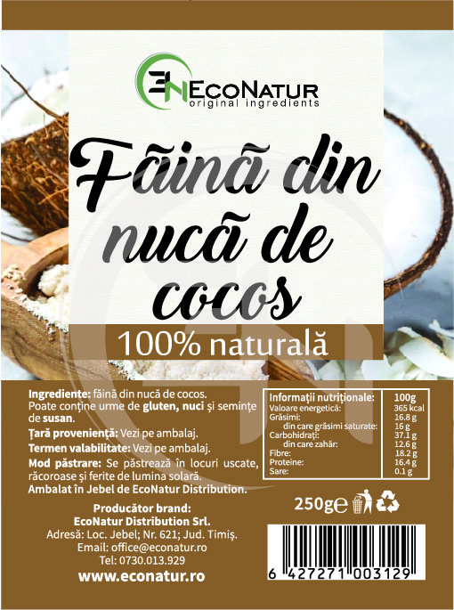 Făina de cocos este un produs obținut prin deshidratarea miezului nucii de cocos, 100% natural, fără ingrediente adăugate.Făina de nucă de cocos este mai bogată în nutrienți decât făinurile tradiționale pe bază de cereale. Conține fibre, proteine, grăsimi sănătoase și are un indice glicemic scăzut. Are un conținut mic de zahăr, carbohidrați și calorii.