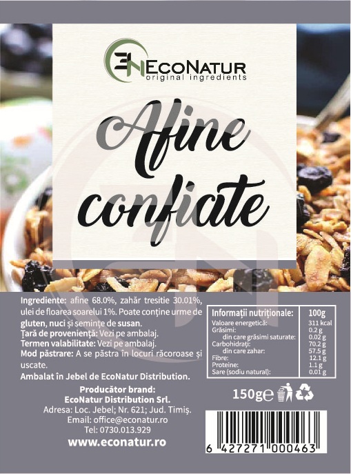 Delicioase și sănătoase, afinele confiate EcoNatur sunt gustarea perfectă pentru oricine dorește să îmbine savoarea naturală cu beneficiile pentru sănătate. Obținute din afine de înaltă calitate, acestea sunt îndulcite ușor cu zahăr de trestie și conservate prin metode blânde, păstrând o mare parte din antioxidanții naturali și vitaminele specifice fructului proaspăt.