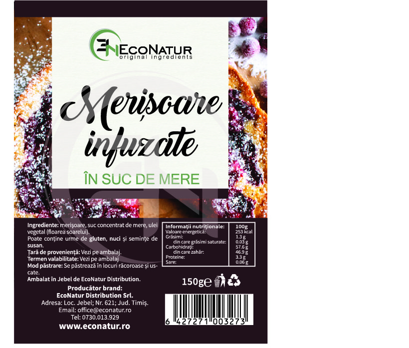 Merișoarele infuzate cu suc de mere Econatur, 150 g – o gustare delicioasă și sănătoasă, perfectă pentru a fi adăugată în salate, cereale, deserturi sau consumată ca atare.