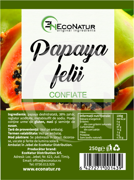 Papaya deshidratată, 38% zahăr, reglator aciditate, metabisulfit de sodiu.