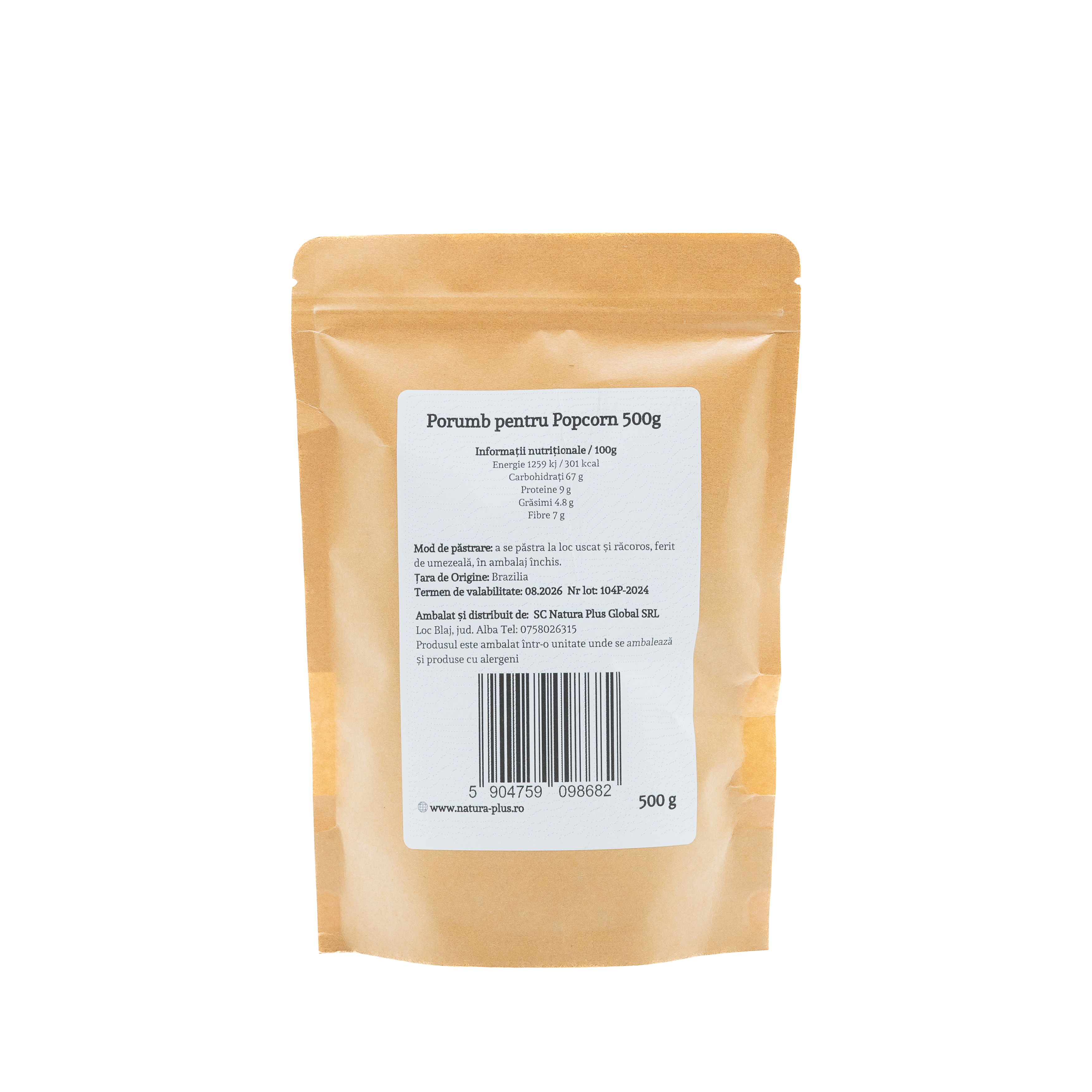 Porumbul pentru popcorn Natura Plus este 100% natural, fără aditivi. Bogat în fibre și antioxidanți, perfect pentru un snack rapid și crocant.