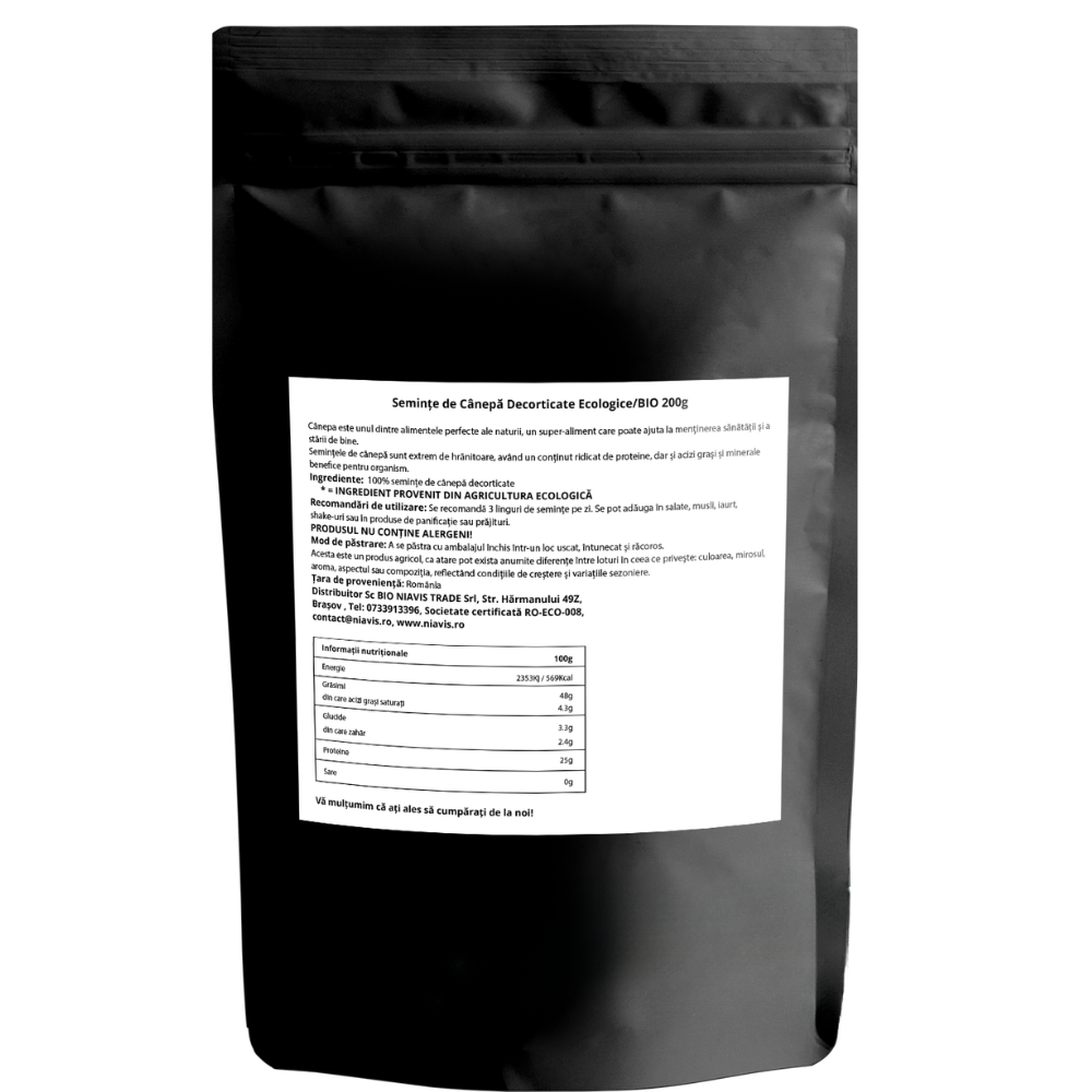 Semințele de cânepă decorticate ecologice BIO sunt un ingredient natural, obținut din agricultură ecologică certificată. Acestea sunt apreciate pentru profilul lor nutrițional echilibrat, fiind ușor de integrat în alimentația zilnică. Datorită gustului lor neutru și texturii fine, pot fi adăugate în numeroase preparate culinare.