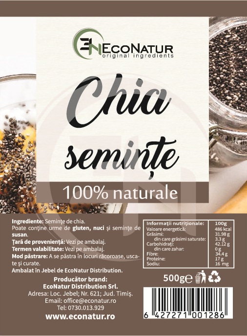 Semințe chia. Acest produs nu conţine şi nu este alcătuit din organisme modificate genetic.