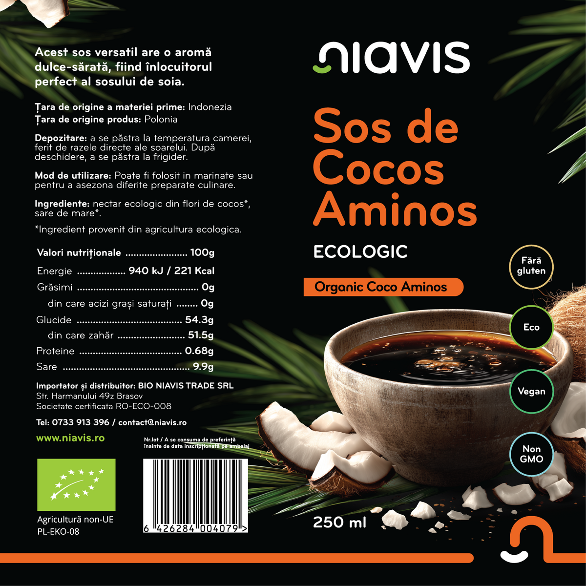 Sosul de cocos aminos ecologic este obținut din nectar fermentat din flori de cocos, combinat cu sare de mare, rezultând un condiment lichid cu aromă echilibrată dulce-sărată. Are un gust mai blând comparativ cu sosul de soia și poate fi integrat cu ușurință în diferite rețete culinare.